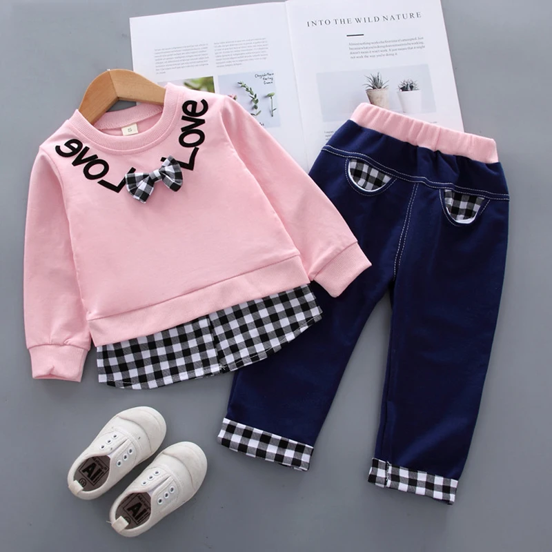 Весенне-осенний комплект одежды для девочек, милый комбинированный Топ с длинным рукавом и надписью и штаны, спортивная детская одежда из 2 предметов, Женский комплект