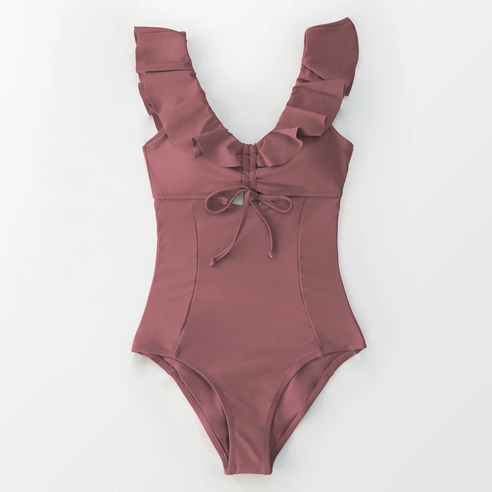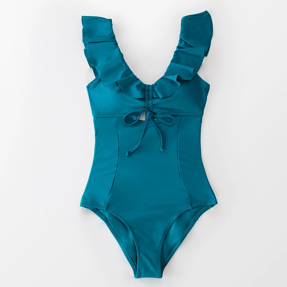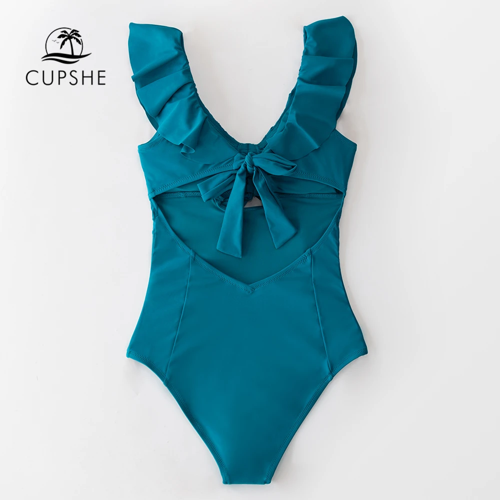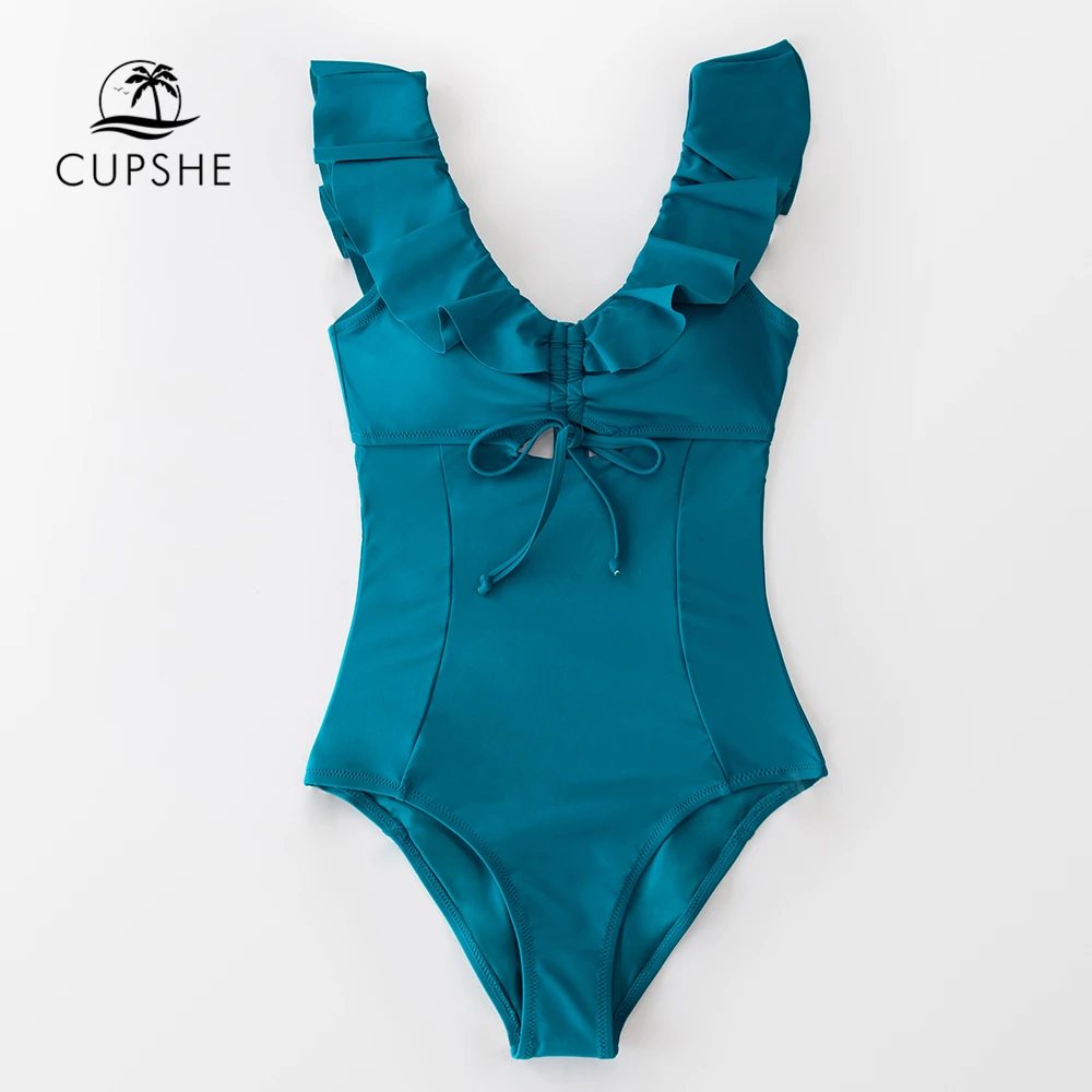 CUPSHE Цельный купальник с v-образным вырезом и оборками для женщин, сексуальный Одноцветный купальный костюм со шнуровкой сзади, бирюзовый Монокини, 2022, пляжный купальный костюм, купальник