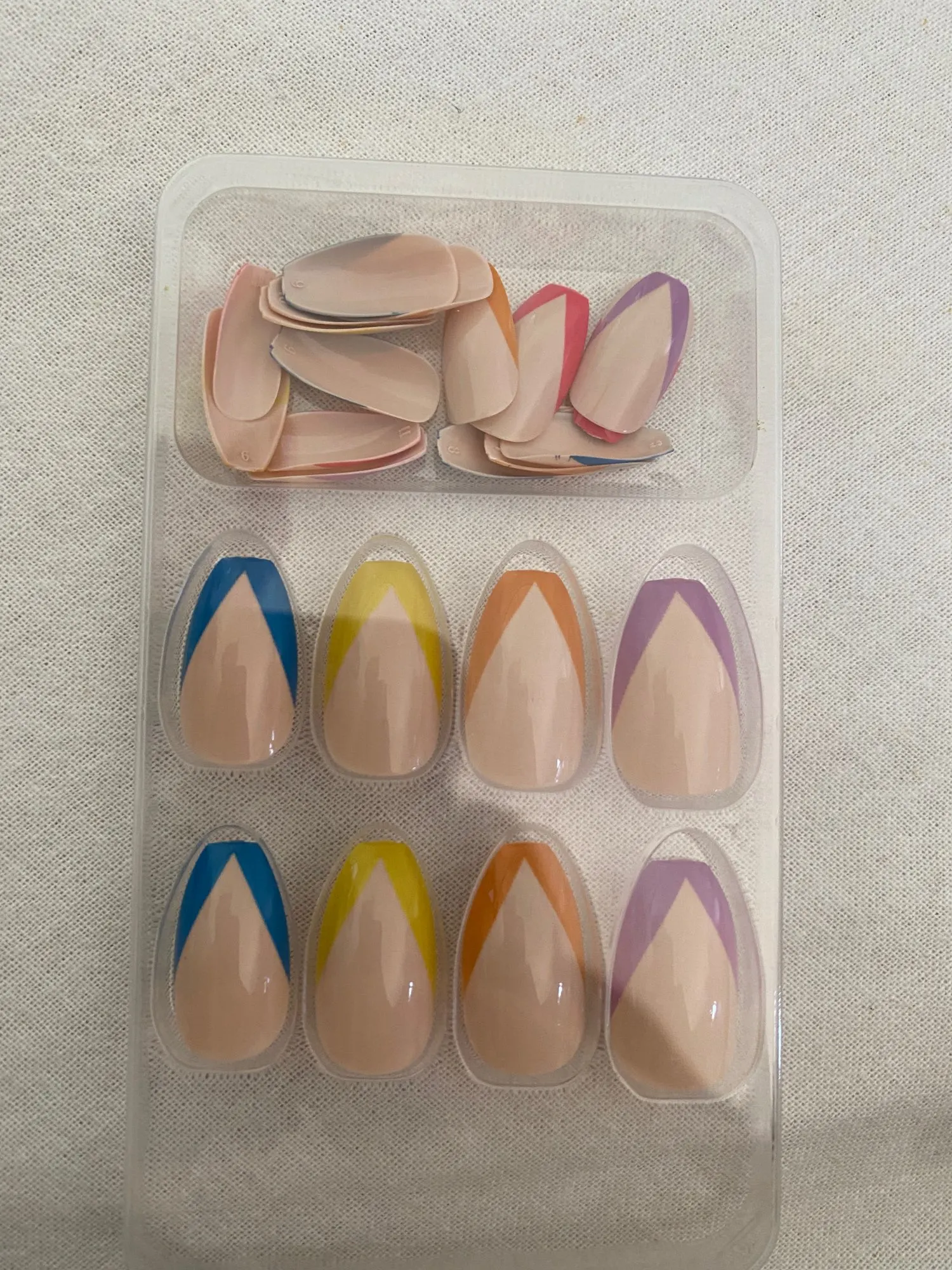 100% новый товар высокого качества.Материал изделия: АБС-пластикТип изделия: миндальПростота в использованииПодходит для использования с гелем, акрилом или стекловолокном.Посылка включает в себя:24 шт./кор. накладные ногти + пресс клей