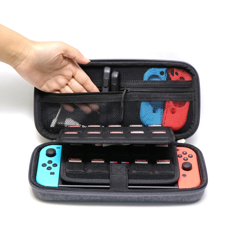 Большой сетчатый карман на молнии обеспечивает безопасное место для хранения некоторых небольших аксессуаров Nintendswitch, таких как зарядный кабель, тонкий блок питания, амбушюры и 2 дополнительных джойстика, легче закрывать и удобно носить с собой. Он также имеет 19 больших слотов для игровых карт и 2 маленьких слота для карт, что позволяет носить с собой и менять любимые игры в любое время и в любом месте.