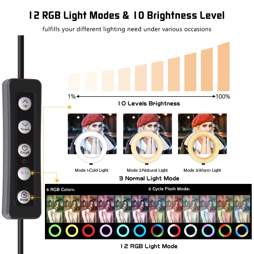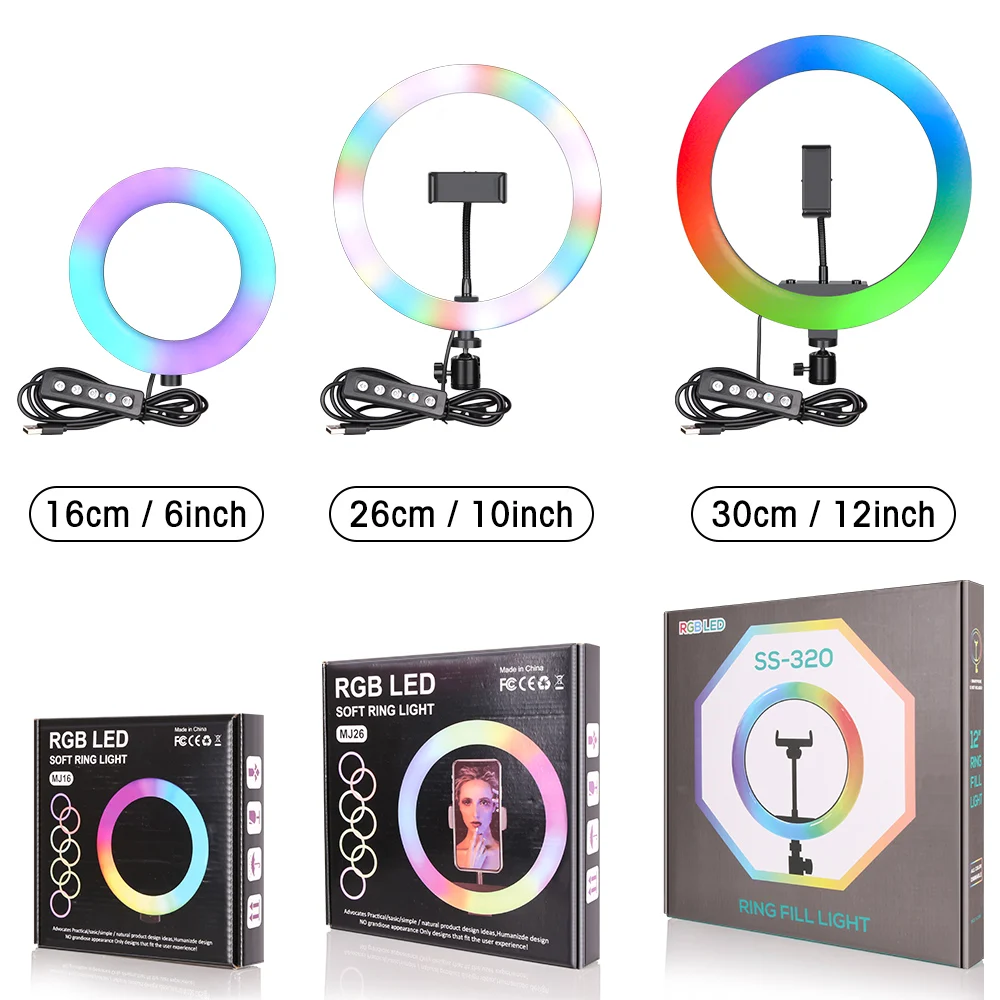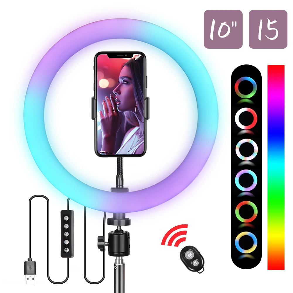 Светодиодный кольцевой светильник RGB 61012 дюймов, кольцевая лампа для селфи, 15 цветов, 3 модели, без штатива, с usb-разъемом для YouTube, Live Makeup