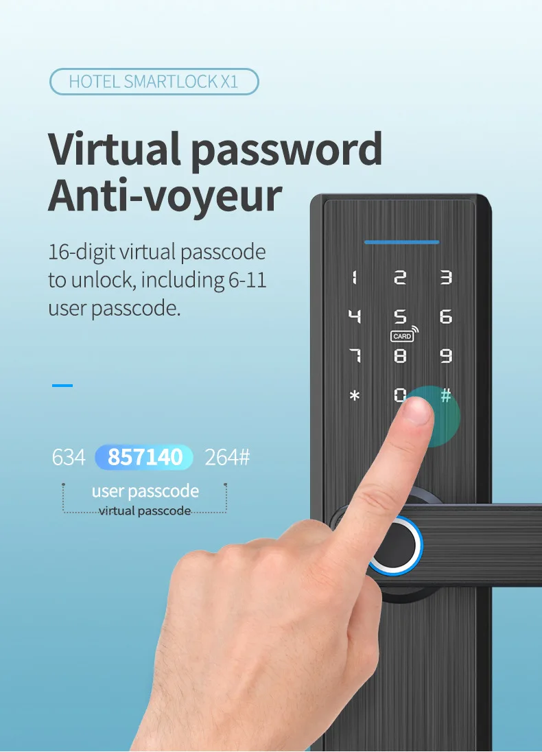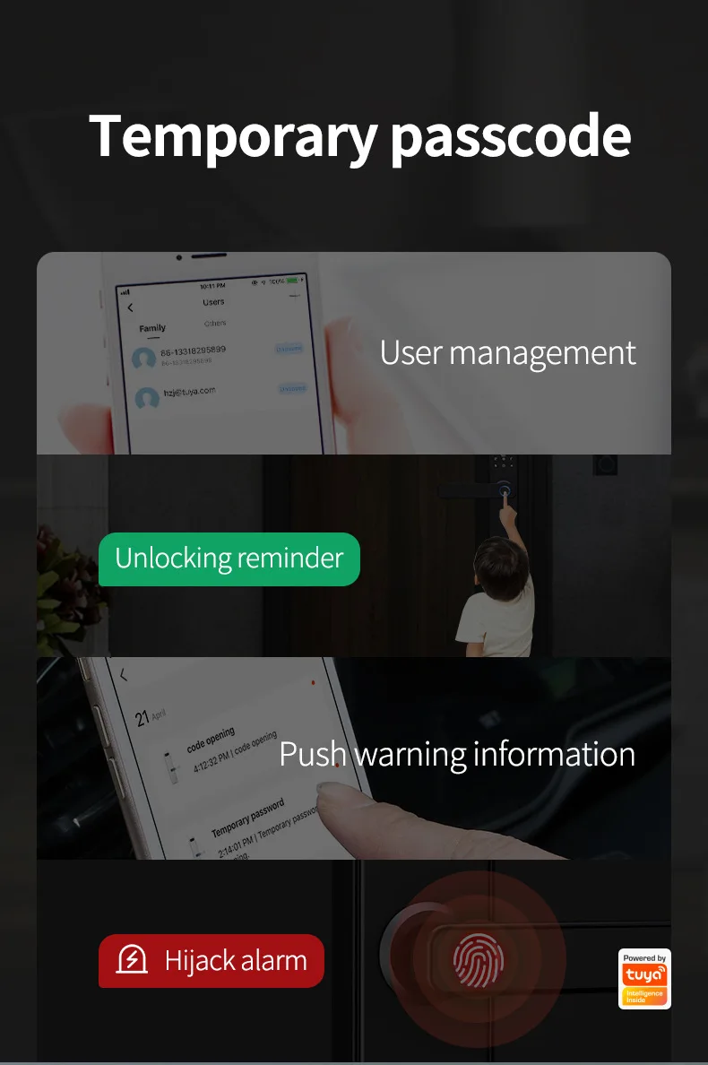 Модель: x1-tuyaМатериал: алюминиевый сплавРежим разблокировки: отпечаток пальца/Пароль/смарт-карта/ключСчитывание отпечатков пальцев: Датчик FPC (полупроводниковый датчик)Цвет: черныйТип чипа: двухъядерный драйверВремя: 0,3 секундСенсорный экран: IML материалРабочая мощность: 4 х ААА 1,5 В батареи (не входит в комплект)Рабочая температура: от-25 до 55 градусов по ЦельсиюФункция пароля: Поддержка виртуального пароляПодходит для двери толщиной около 35 -50 мм
