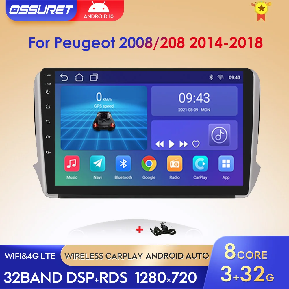 Автомагнитола на Android 10, мультимедийный стерео-проигрыватель с GPS-навигацией для Peugeot 2008, 208, 2012-2018, Wi-Fi, 4G, LTE, 2 Гб, 32 ГБ, BT, без DVD