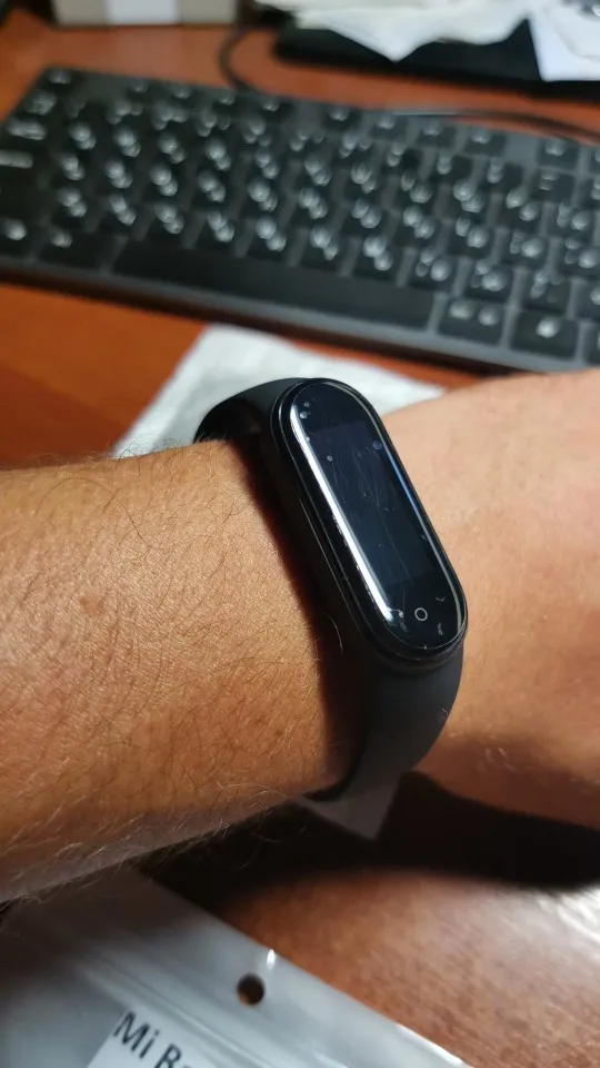 Черный Защитный чехол хорошо прилипает к экрану из-за его 3D формы. Прозрачный чехол, который я заказал здесь, полностью плоский пластик, который бесполезен на круглом дисплее Mi Band. У него есть край со всех сторон, который вы продолжаете трогать пальцем во время навигации по меню группы. Таким образом, он быстро упадет. Не используйте наклейки «пылеочиститель», которые поставляются с плоской пластиковой пленкой. К сожалению, сначала я проверил их на запасной черной крышке. При снятии клея они по всей поверхности оставляют клейкий клей. Это можно увидеть на картинке с черной 3D крышкой. Правая сторона имеет большой, слегка белый круг. Да, это клей.