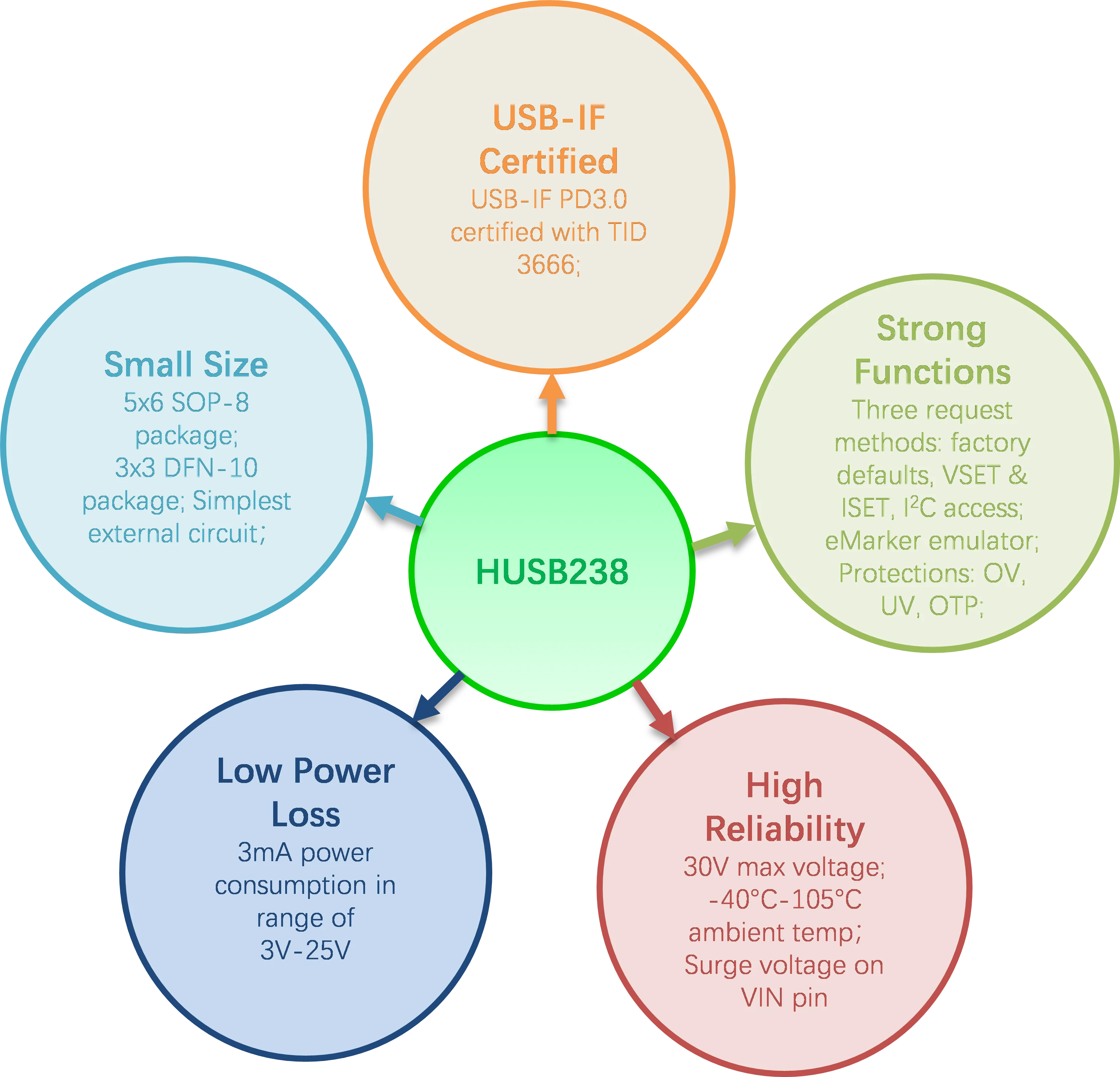 Рис. 2. Преимущества HUSB238HUSB238 получил сертификацию PD3.0 USB-IF и имеет отличную производительность в совместимости, надежности и производительности. При высокой температуре окружающей среды 125 °C в Huinengtai лаборатории, HUSB238 выдержал более чем на сто тысяч раз 0V-алюминиевая крышка, 25В быстрого напряжение пульсации.