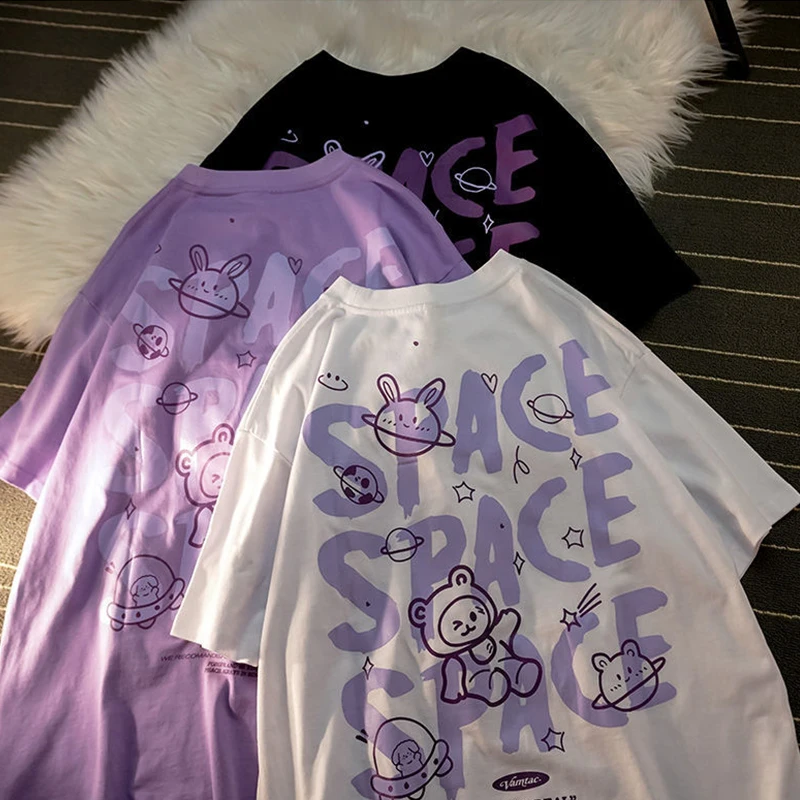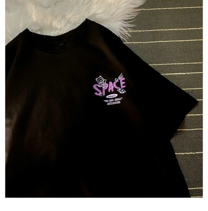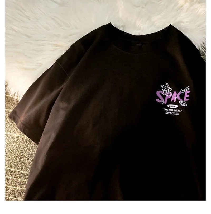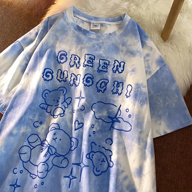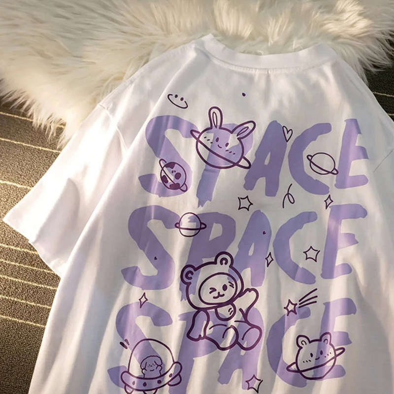 Хлопковая свободная футболка с принтом медведя и граффити с коротким рукавом, летняя Винтажная футболка в стиле Харадзюку, Милая футболка y2k, топ с круглым вырезом