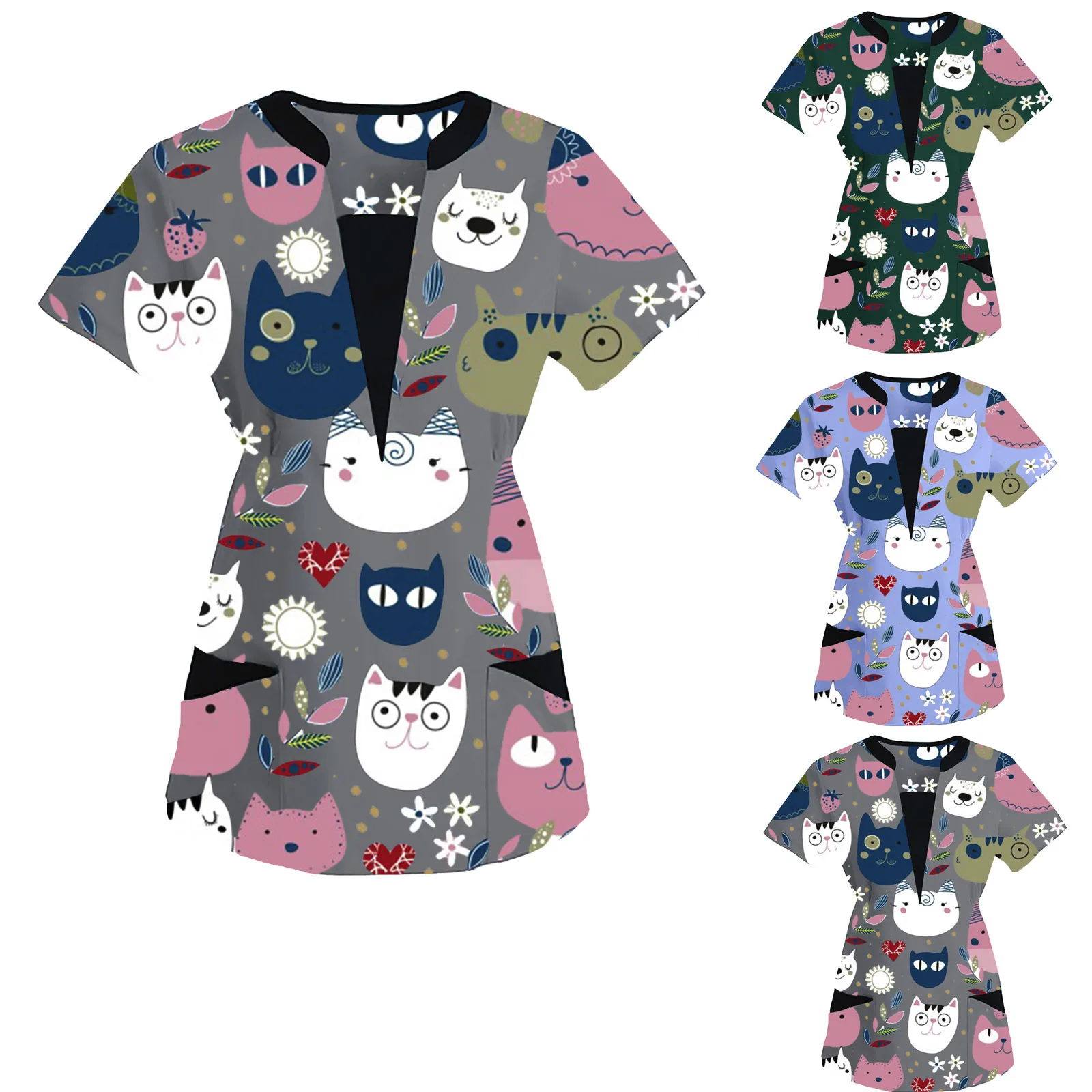 Женская рубашка с коротким рукавом, V-образным вырезом и карманами