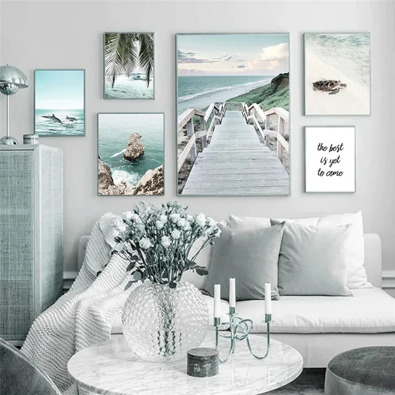 Плакат с изображением летних каникул пляжа Морского Пейзажа и дельфинов пальмового моста на голубом холсте, настенная живопись, картины для декора