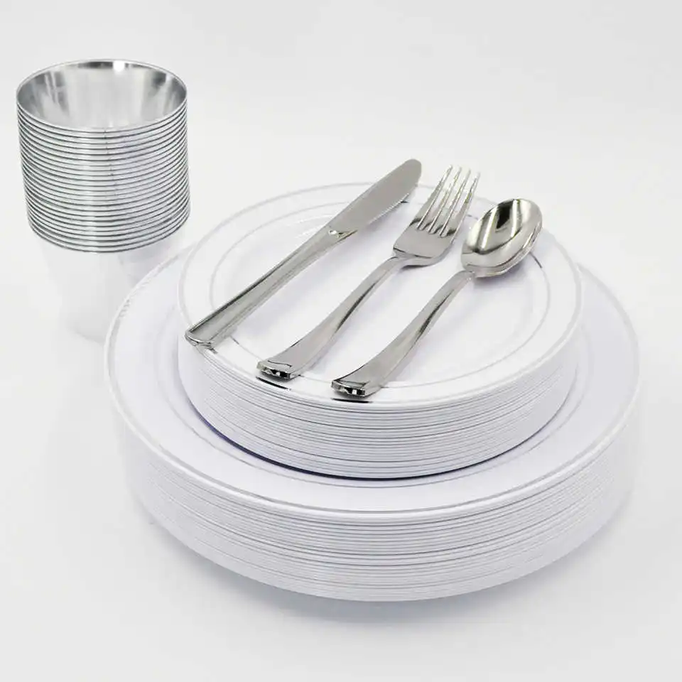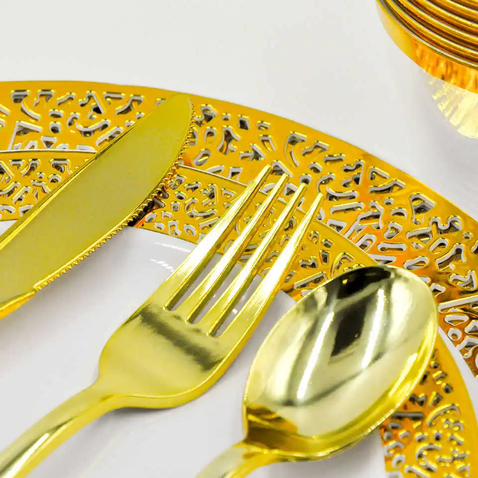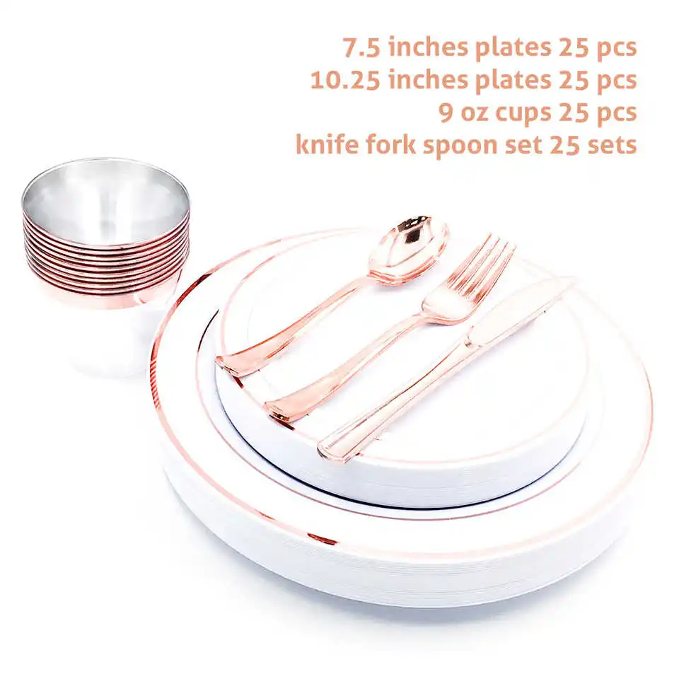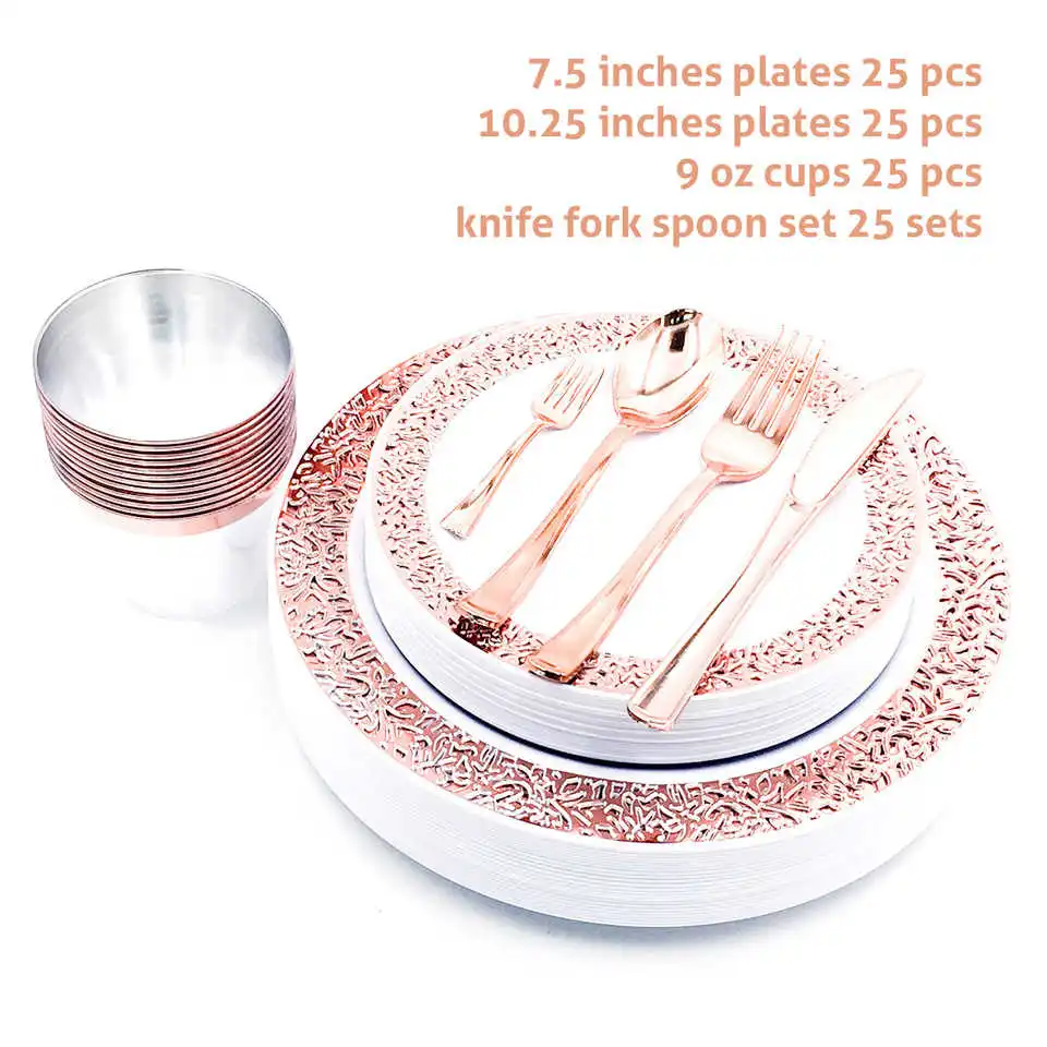 Nicro 150 шт.компл. чашки из серебра и розового золота пластиковые тарелки вилки Ножи Ложки одноразовый прозрачный набор посуды