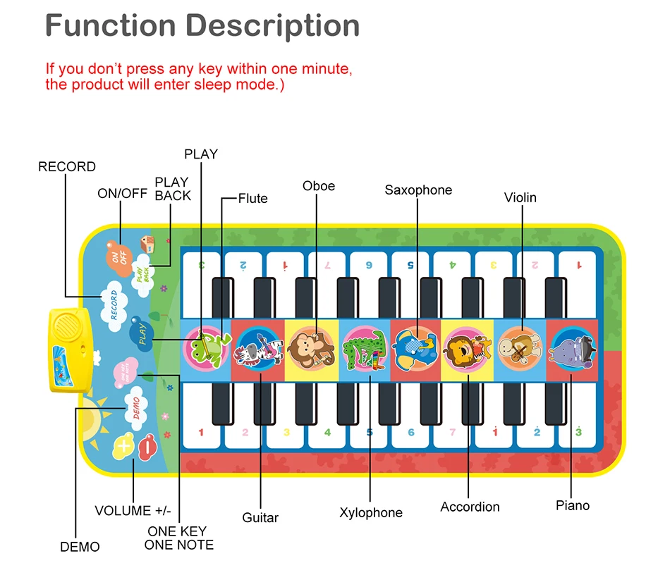 Встроенные богатые песни сопровождения, мягкий и приятный звук, красочные и мягкие огни; Двухрядные клавиши, тренировка координации рук и ног; Восемь инструментов звуковые эффекты: флейта, гитара, гобой, саксофон, аккордеон, скрипка, пианино; Регулируемая громкость, функция записи и воспроизведения.