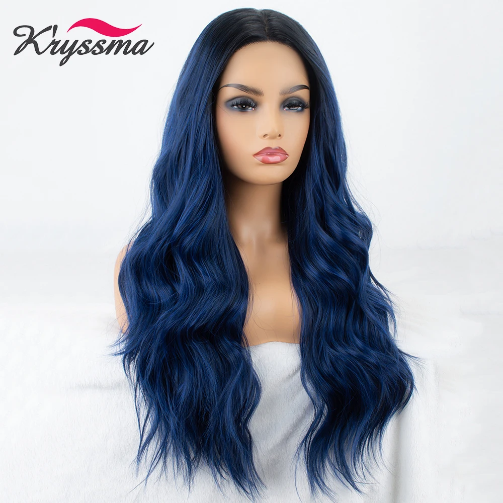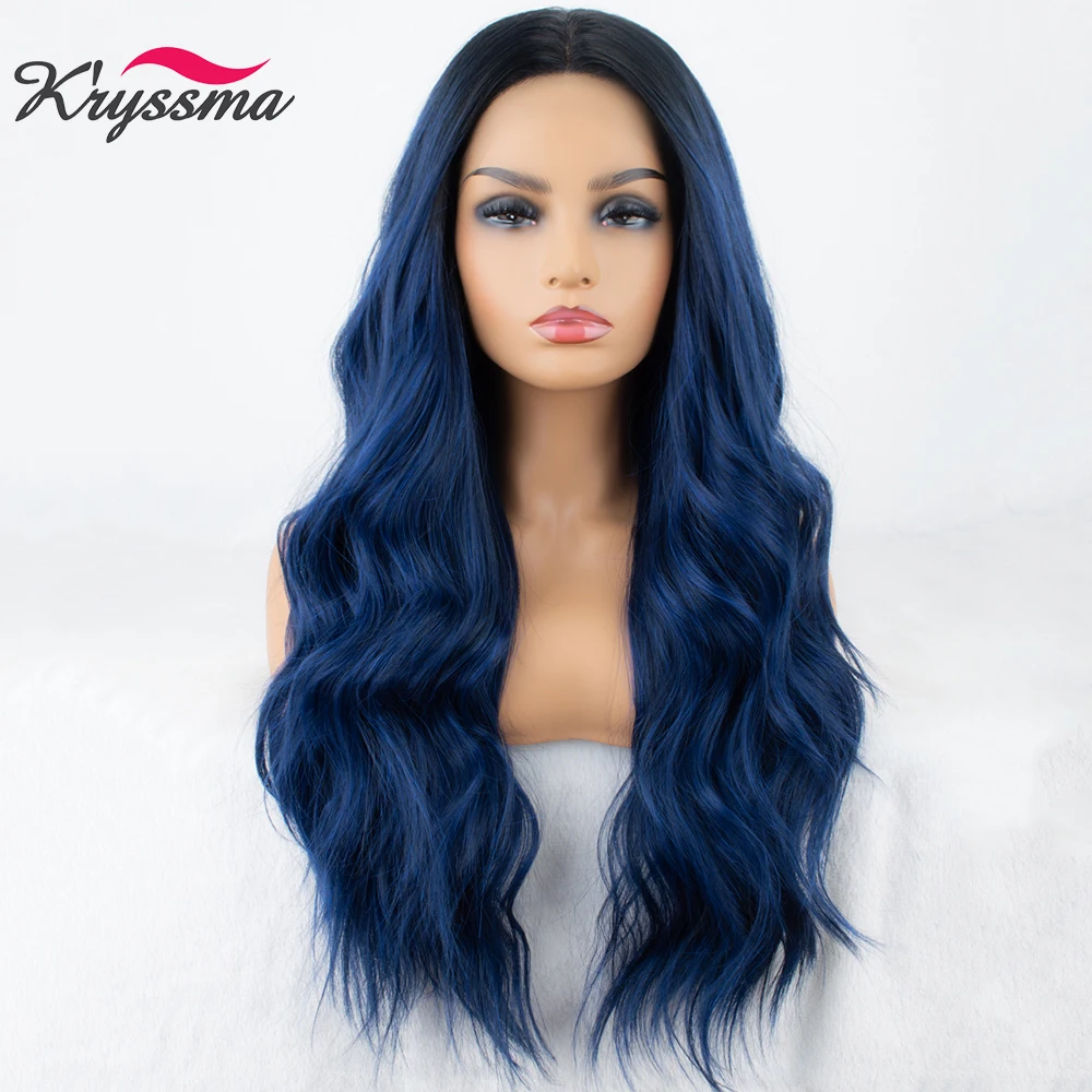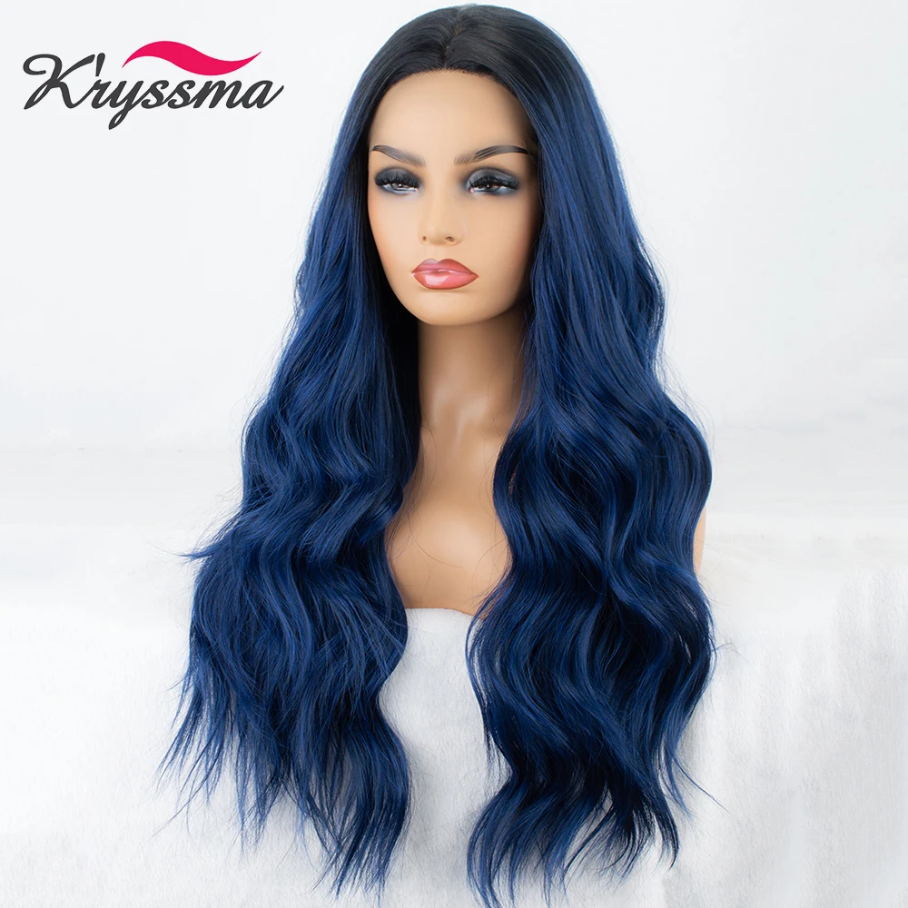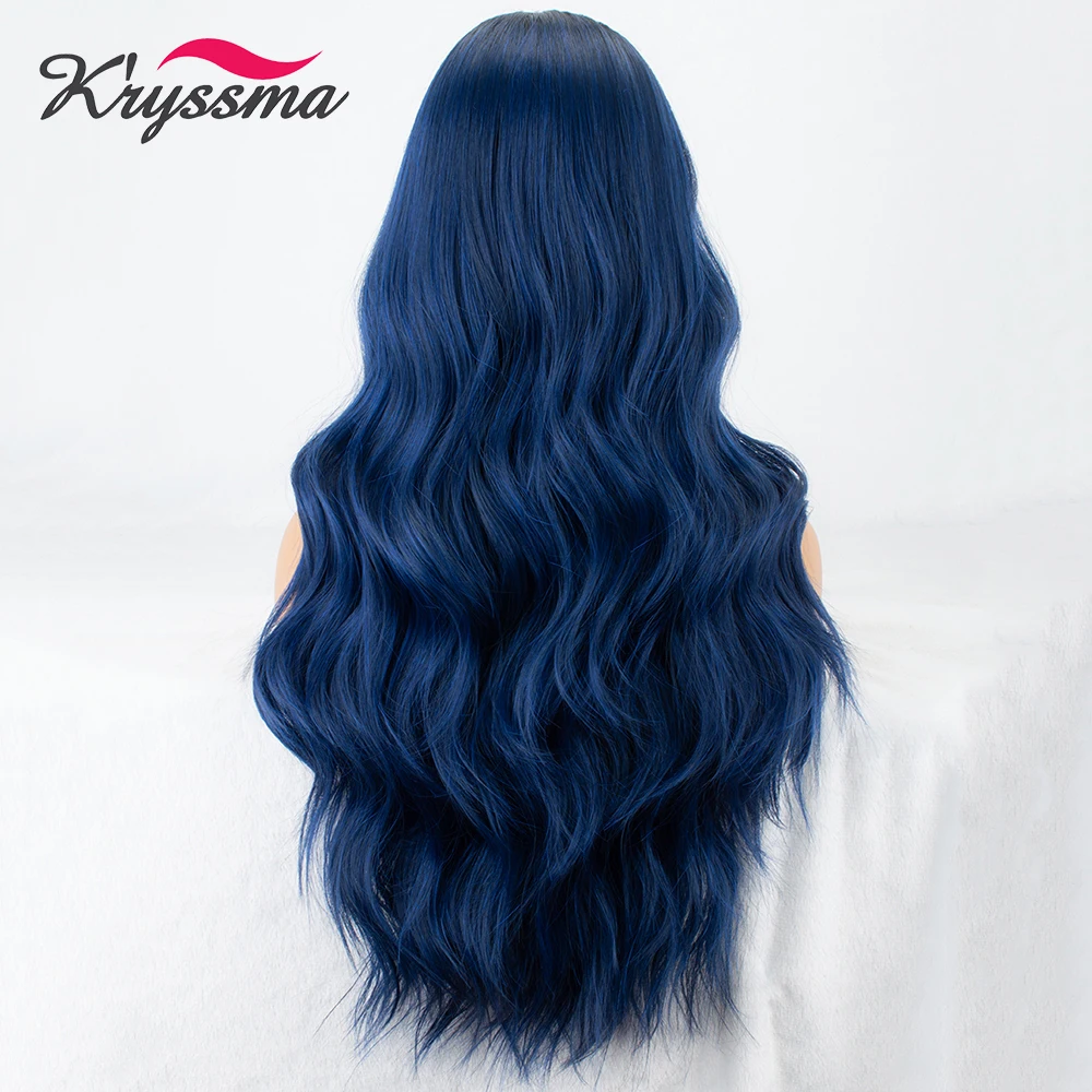 Kryssma синие длинные волнистые синтетические кружевные передние парики предварительно выщипанные боковые части термостойкие волосы на сетке волнистый парик для модных женщин