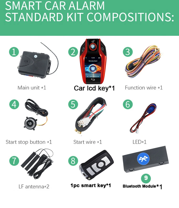 Основной блок-1 шт., стартовые кабели-1 шт., основные кабели-1 шт., автомобильный жидкий ключ-1 шт., умный ключ-1 шт., антенны-2 шт., кнопка запуска-1 шт., 1 шт. Bt модуль (подарок!),1 светодиодный светильник, 1 цветная коробка.