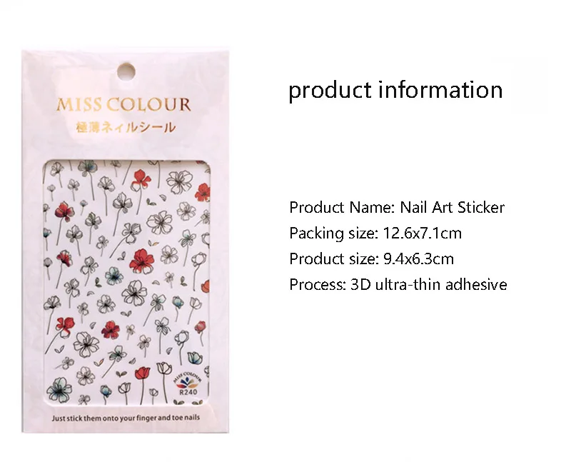 Название продукта: стикер для дизайна ногтей Размер упаковки: 12,6x7,1 см Размер изделия: 9,4х6, 3 см Процесс: 3D ультратонкий клей Посылка: 1 Лист наклейки для ногтей Как использовать: 1. Нанесите слой лака для ногтей, 2. Выберите рисунок и снимите его пинцетом, 3. Свободно смешивать и сочетать узоры, 4. Нанесите слой лака для защиты.