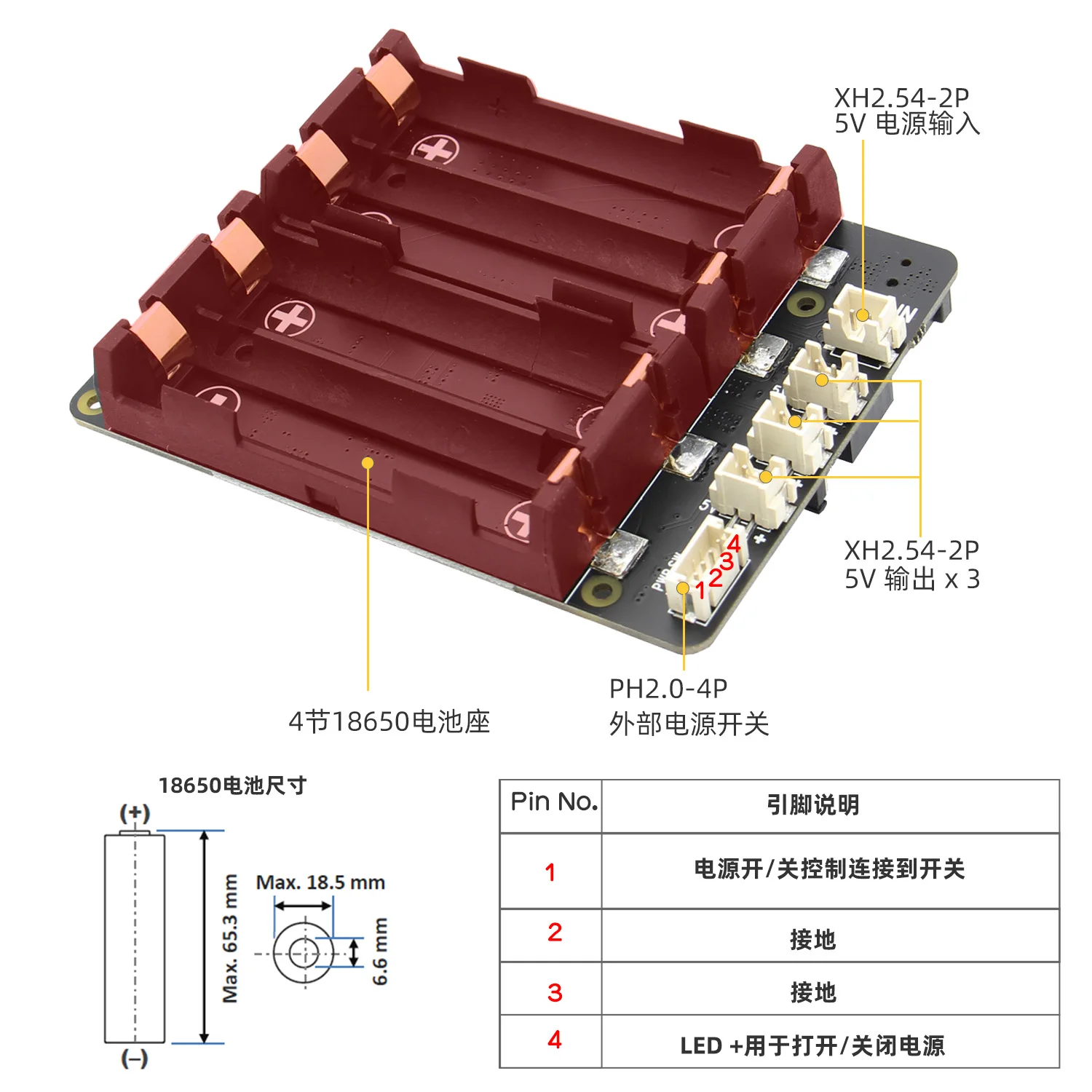 Входная мощность: 5Vdc ± 5%, ≥ 4AUPS ток на выходе: 5,1 V ± 5% Максимальная 8AUPS ток зарядки: 2А через разъем Micro-USB, 3А через разъем постоянного токаНапряжение клеммной батареи: 4,24 ВЗарядка порог: 4,1 VРекомендации по приобретению аккумуляторов 18650: пожалуйста, купите аккумуляторы 18650 больших брендов как можно больше. Батареи 18650 не должны быть оснащены защитной пластиной, в противном случае Зарядка будет медленной;Примечание