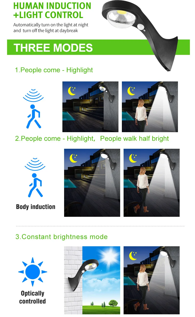 (Автоматически загорается в темноте.)Режим 1: люди приходят-выделяют;Режим 2: люди приходят-выделяются, люди ходят наполовину ярче;Режим 3: режим яркости Conatant.
