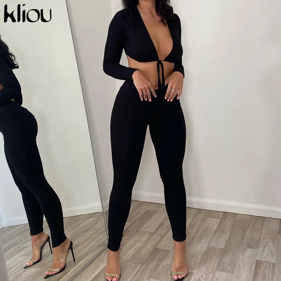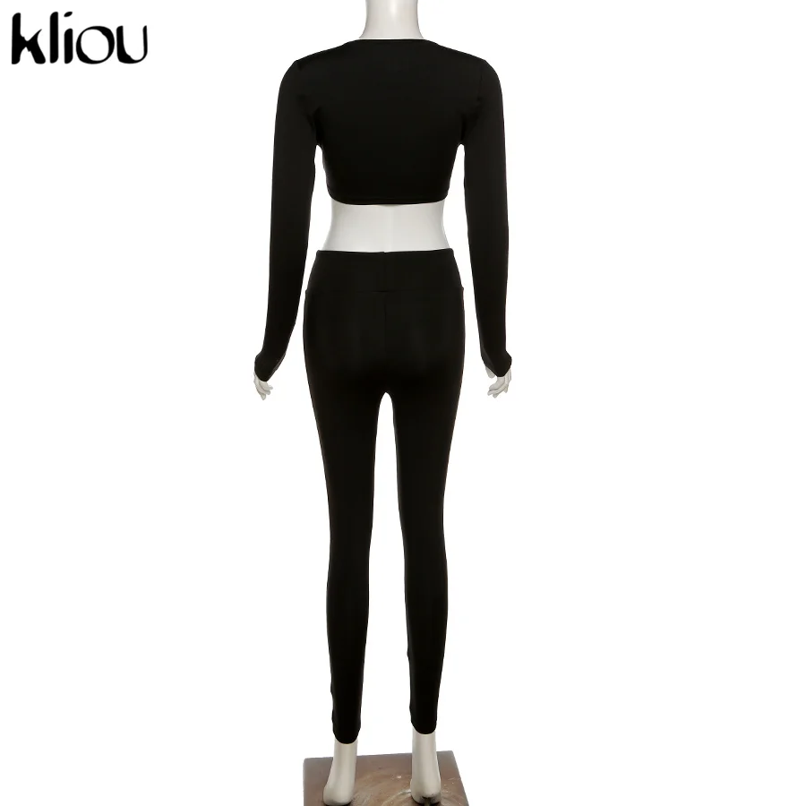 Женский комплект из двух предметов Kliou, спортивный облегающий топ с v-образным вырезом и длинным рукавом + однотонная спортивная одежда