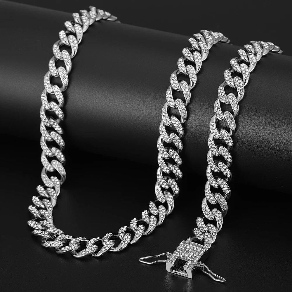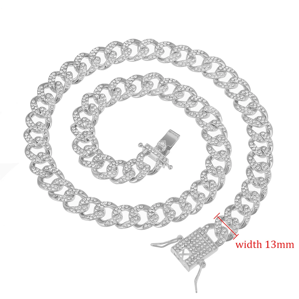 13 мм Miami Prong кубинская цепь звено серебряного цвета ожерелья 2 ряда Полный Стразы браслет набор для мужчин