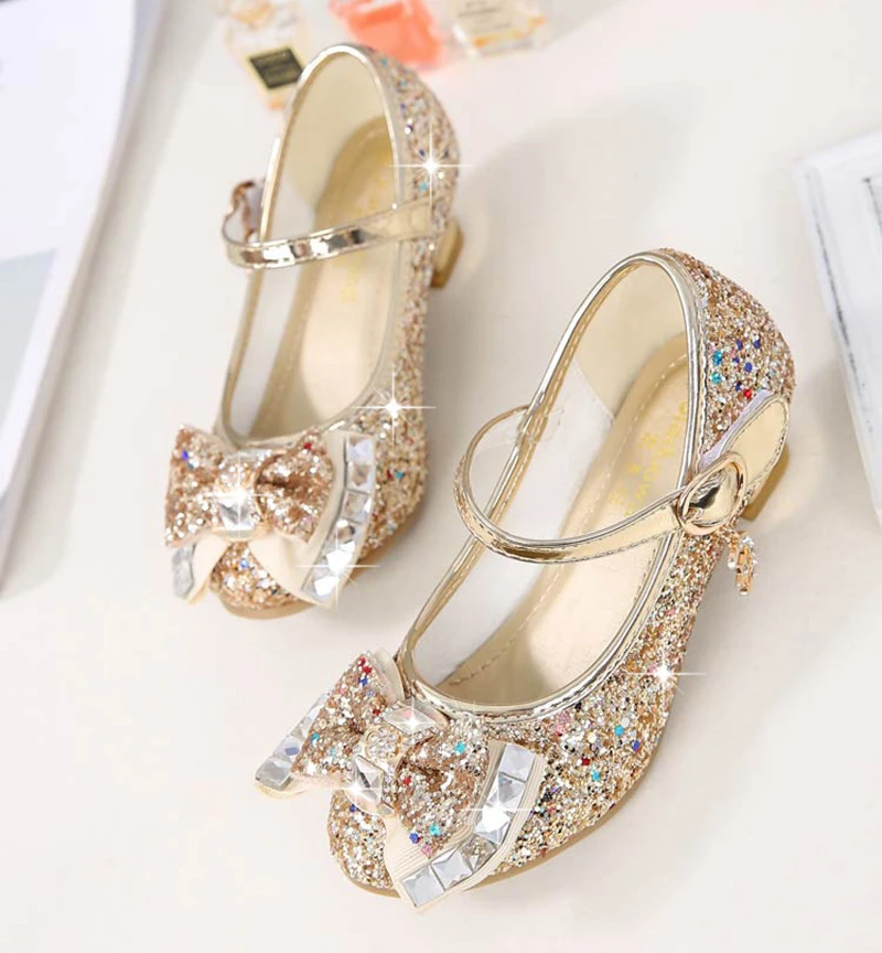 Босоножки принцессы Детские кожаные, повседневные сандалии на высоком каблуке, с цветами, блестками, с бантом-бабочкой, для дня рождения вечерние свадьбы, летние