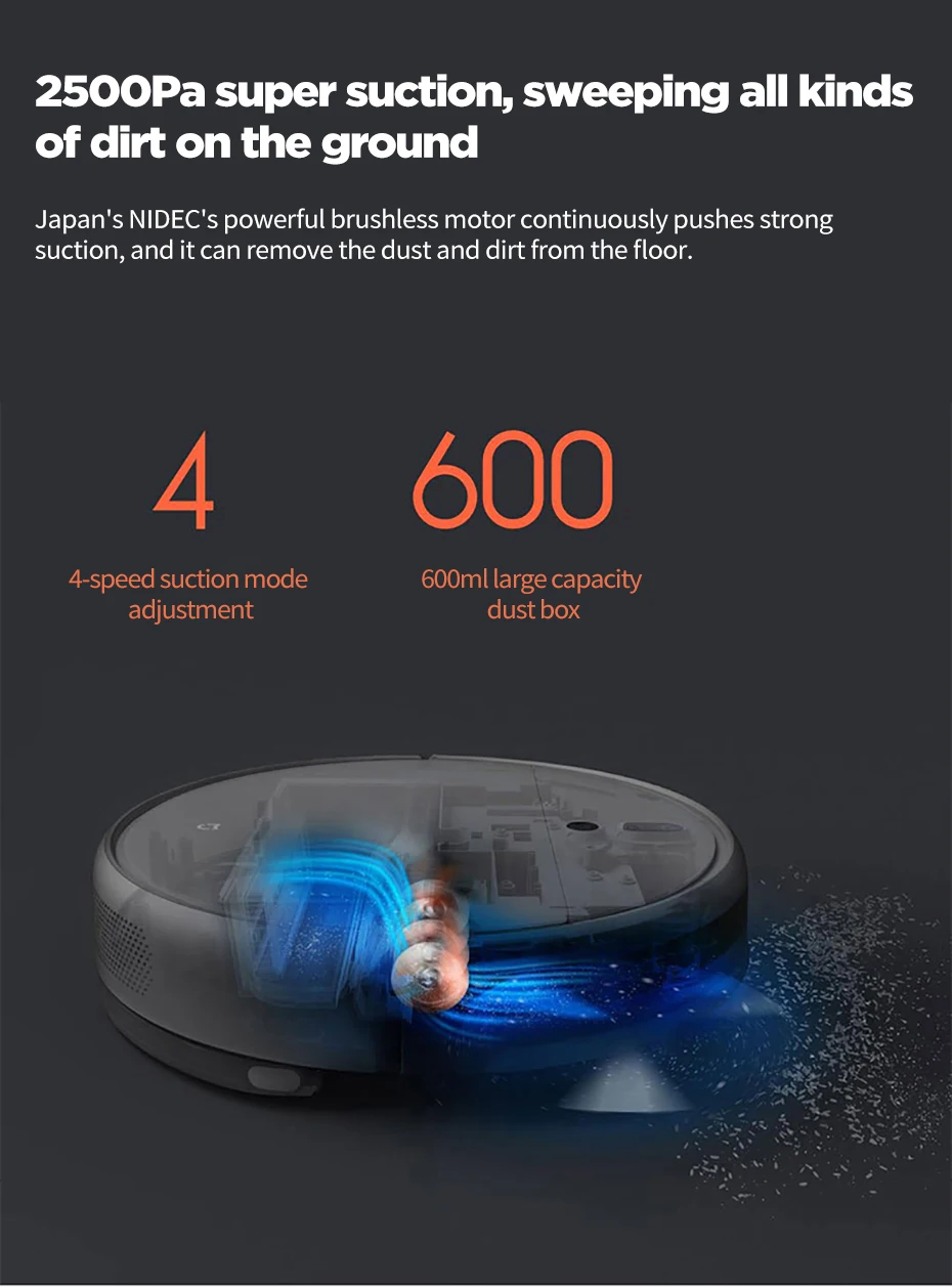 ● Визуальная динамическая навигационная системаБыстро захватывает информацию о координатах, извлекает сложные пространственные особенности, поддерживает динамические исследования во время путешествий, более точно и эффективно сопоставляет карты.● Взьем + 4-х ядерный ПроцессорБолее расчетное, способное найти точное положение робота в режиме реального времени и разумно нарисовать рабочий путь.● Резервуар для воды 200 млТочное управление водой, влажное сопротивление-очиститель.● 2500 ПА Мощное всасываниеОснащен бесщеточным Мотором, регулирует дизайн воздуховода, легко впитывает частицы пыли.● Всасывание подвески + мощная основная щеткаПрисоска большого диаметра, близко к земле.● Высокоточный датчик15 типов разнонаправленных датчиков, чувствительных к различным комплексным условиям, легко избежать препятствий.● Пульт дистанционного управления с приложением MijiaНазначение очистки, не дома также может контролировать.● Пересекающее препятствие 20 ммЛегко поднимается по порогу, рельсам, ковру.● 8,2 см стройное телоЛегко дойти до нижней части кровати, шкафа и дивана.● Автоматическая зарядкаАвтоматически заряжается при менее 15% заряда батареи. Когда аккумулятор заряжается до 80%, вернитесь в положение отключения питания и продолжайте подметать.