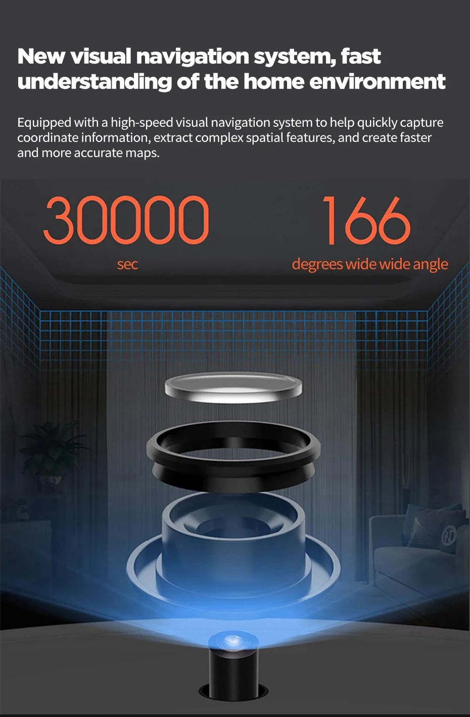 Новая система визуальной навигацииБыстро понять домашнюю средуОснащен высокоскоростной визуальной навигационной системой,Для быстрого захвата информации о координатах,И извлечение сложных пространственных особенностей.Создание карты происходит быстрее и точнее.30000/сек функция точка приобретенияДинамическая визуализация Панорамное планированиеШирокоугольный угол 166 °