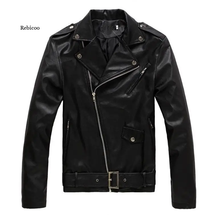 Мужская приталенная куртка из искусственной кожи на молнии с косым воротником