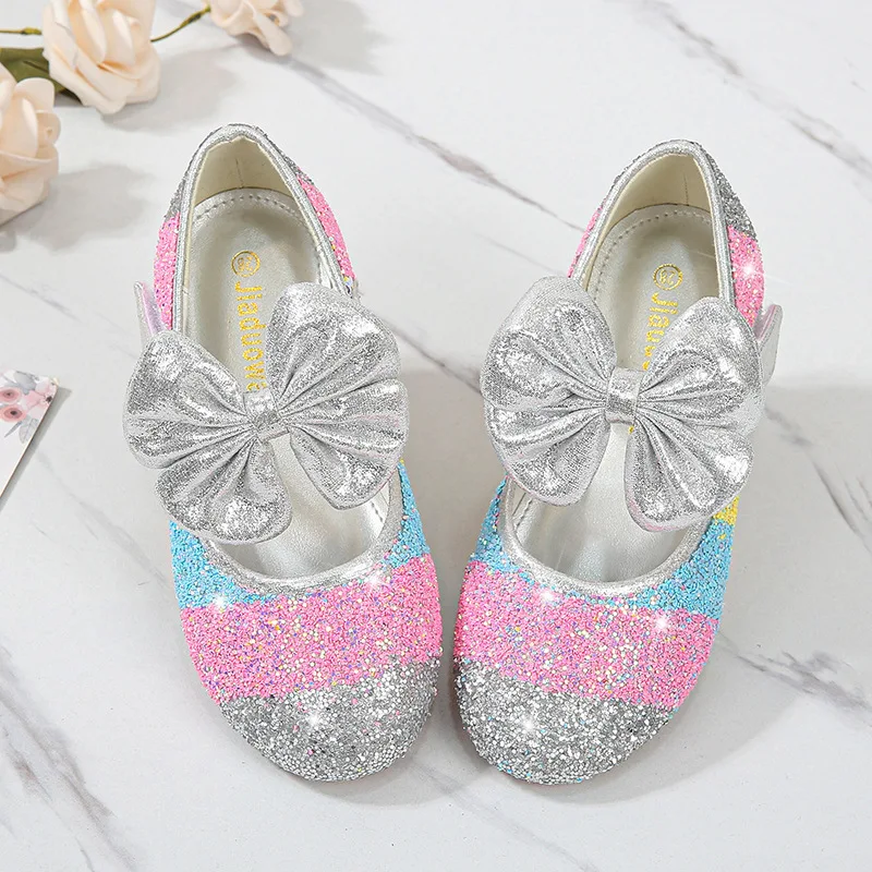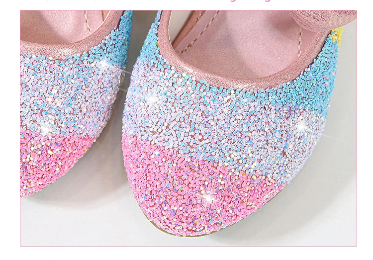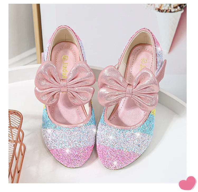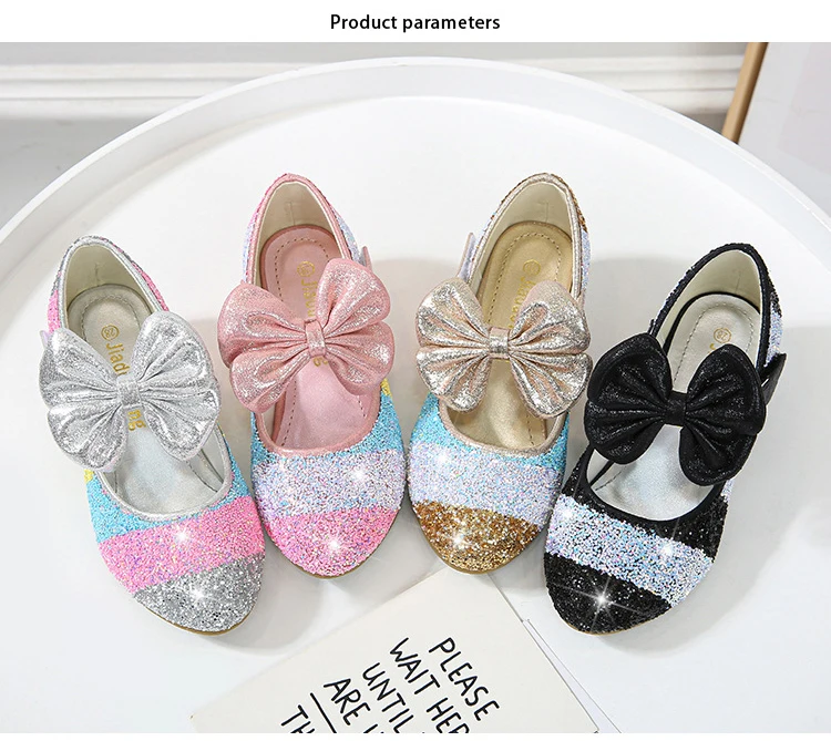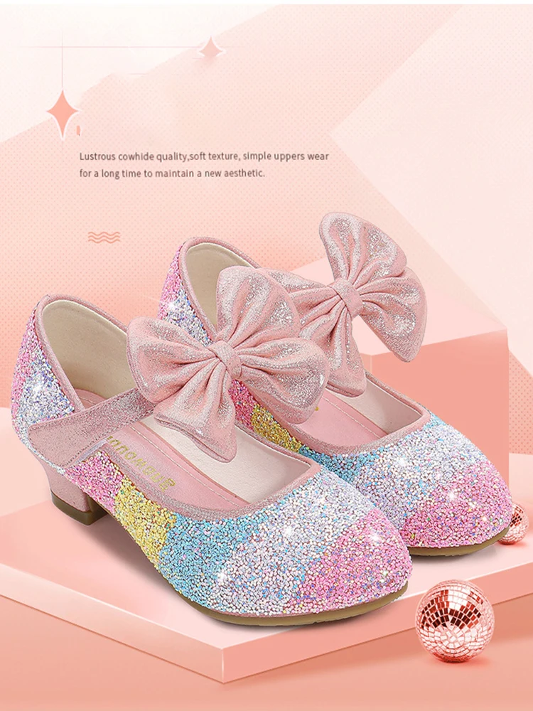 Кожаная обувь для девочек; Детская обувь принцессы с бантом; Круглый носок; Мягкая подошва; Большие Детские высокий каблук; Тонкие вечерние туфли принцессы с кристаллами