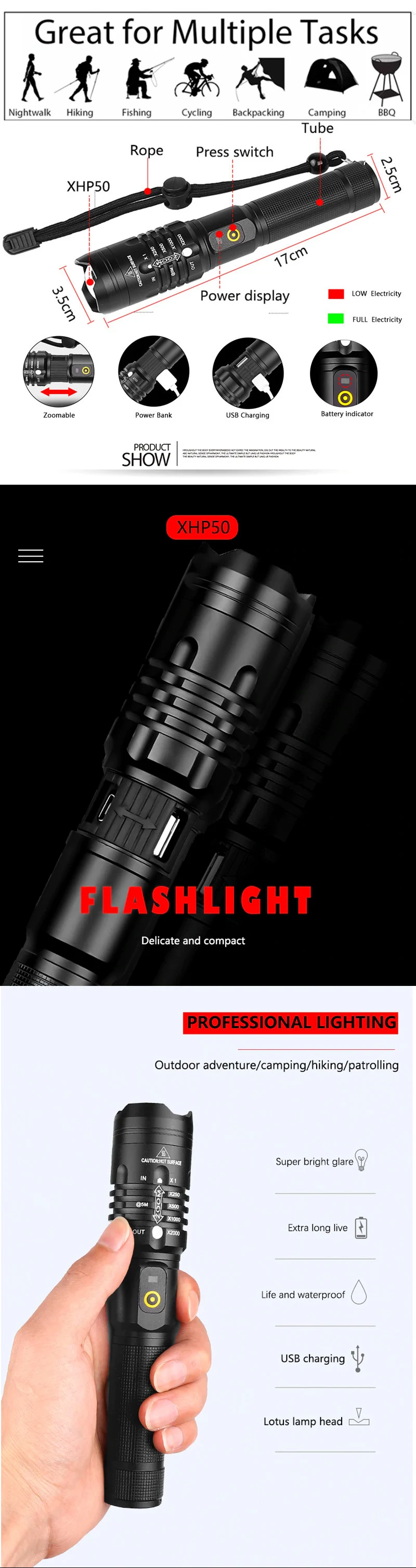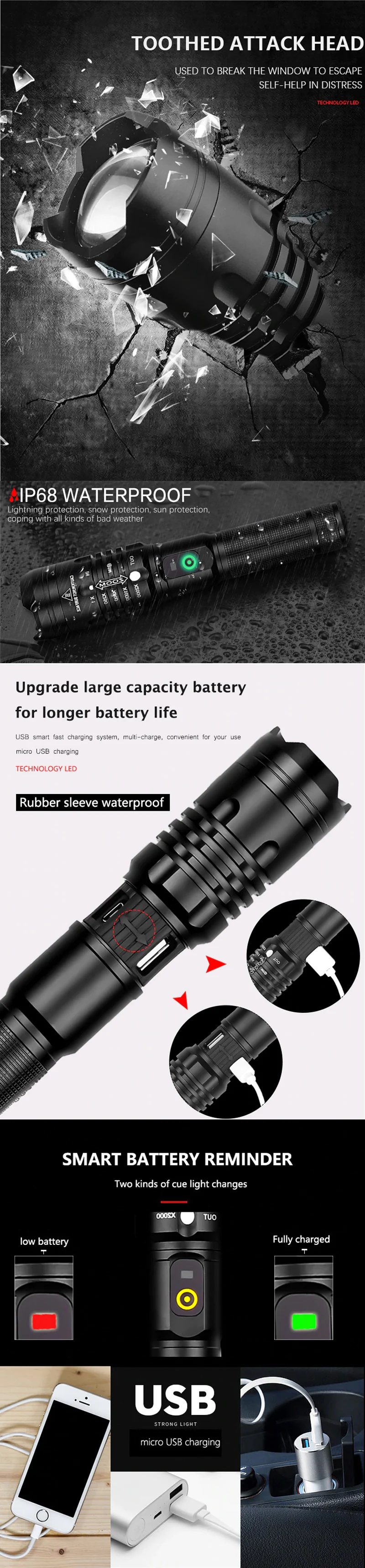 Мощный дизайн яркости: Сверхъяркие лампы CREE XHP50, XHP50 до 4000 люмен, лучший выбор для наружного освещения. 2. Фокусировочная конструкция: высококачественные линзы, фокусисветильник и сисветильник для больших расстояний, удобные для использования светильник освещении; Дизайн масштабирования, дальность действия, широкий диапазон облучения; 3. Защитная конструкция: Водонепроницаемая конструкция IPX7, легко прикрепляется к торту на открытом воздухе; Головка оснащена ударным молотком, который можно использовать для разбивания окон и побега во время кризиса 4. Конструкция переключателя: резиновый материал, поверхностная противоскользящая обработка, сенсорный выключатель света для переключения режима освещения; Имеет 5 светильник МОВ освещения: высокий/средний/низкий/вспышка/SOS; 5. Отображение мощности: оставшаяся мощность определяется цветом кнопки. Зеленый цвет показывает оставшуюся мощность на 25%-100%, а красный цвет-на 1%-25%; 6. Режим питания: зарядка через USB, которую можно заряжать через компьютер, адаптер, автомобильное зарядное устройство, зарядное устройство и т. д.; Функция выхода USB, может заряжать мобильный телефон и другие устройства