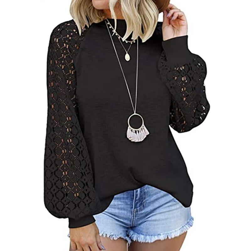 Элегантная кружевная блузка в стиле пэчворк с длинным рукавом, Женская винтажная ажурная Однотонная рубашка с круглым вырезом, осенние женские повседневные уличные Блузы