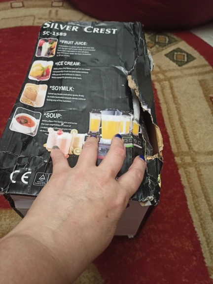 Коробка сильно пострадала,но на ее содержимое это не повлияло.Все в целости.Блендер- супер!,Мощный,чаша на 2литра.Молочный коктейль взбила в крепкую пену .Думаю и с другими функциями на ура справится.Очень понравился.Купила за 2932.Спасибо.