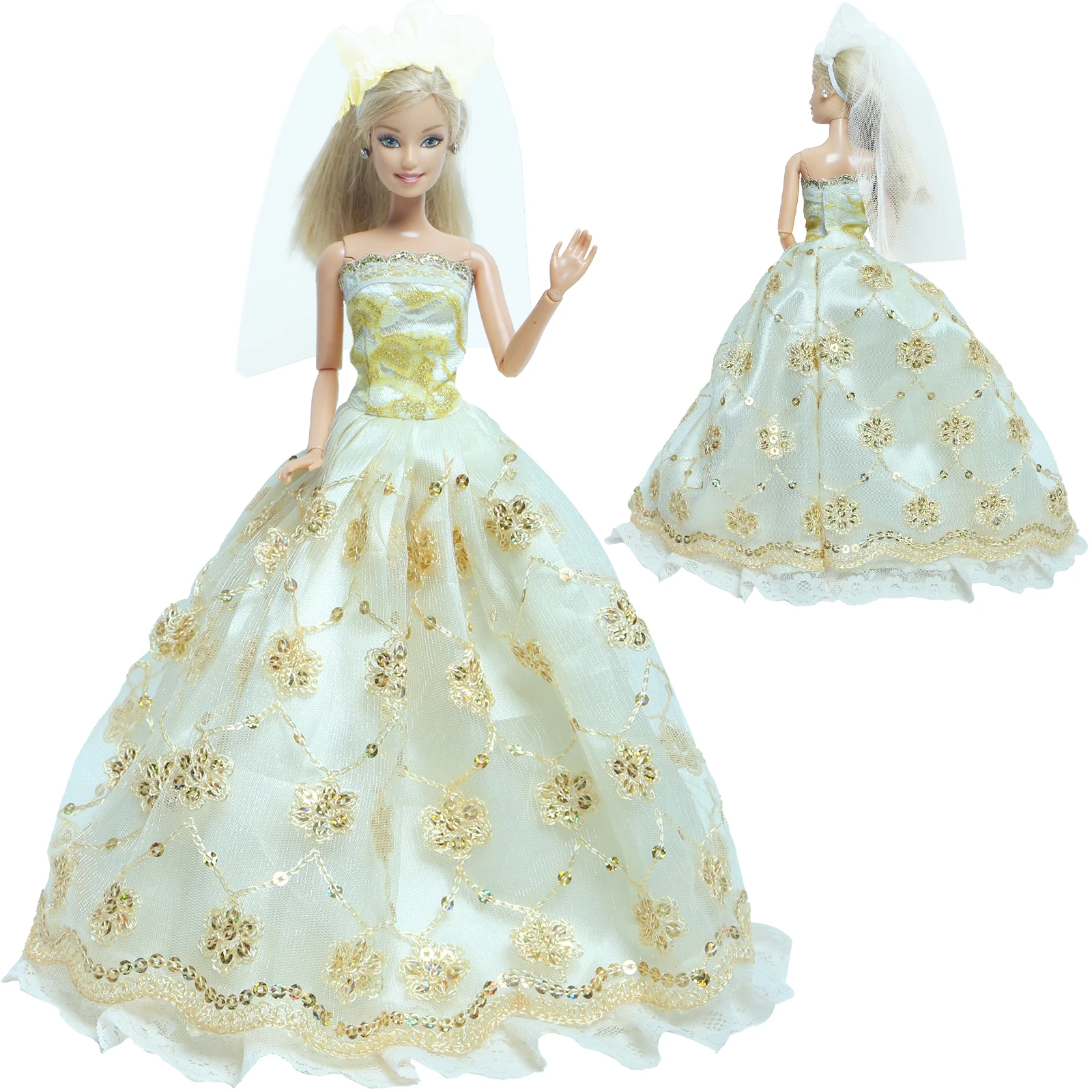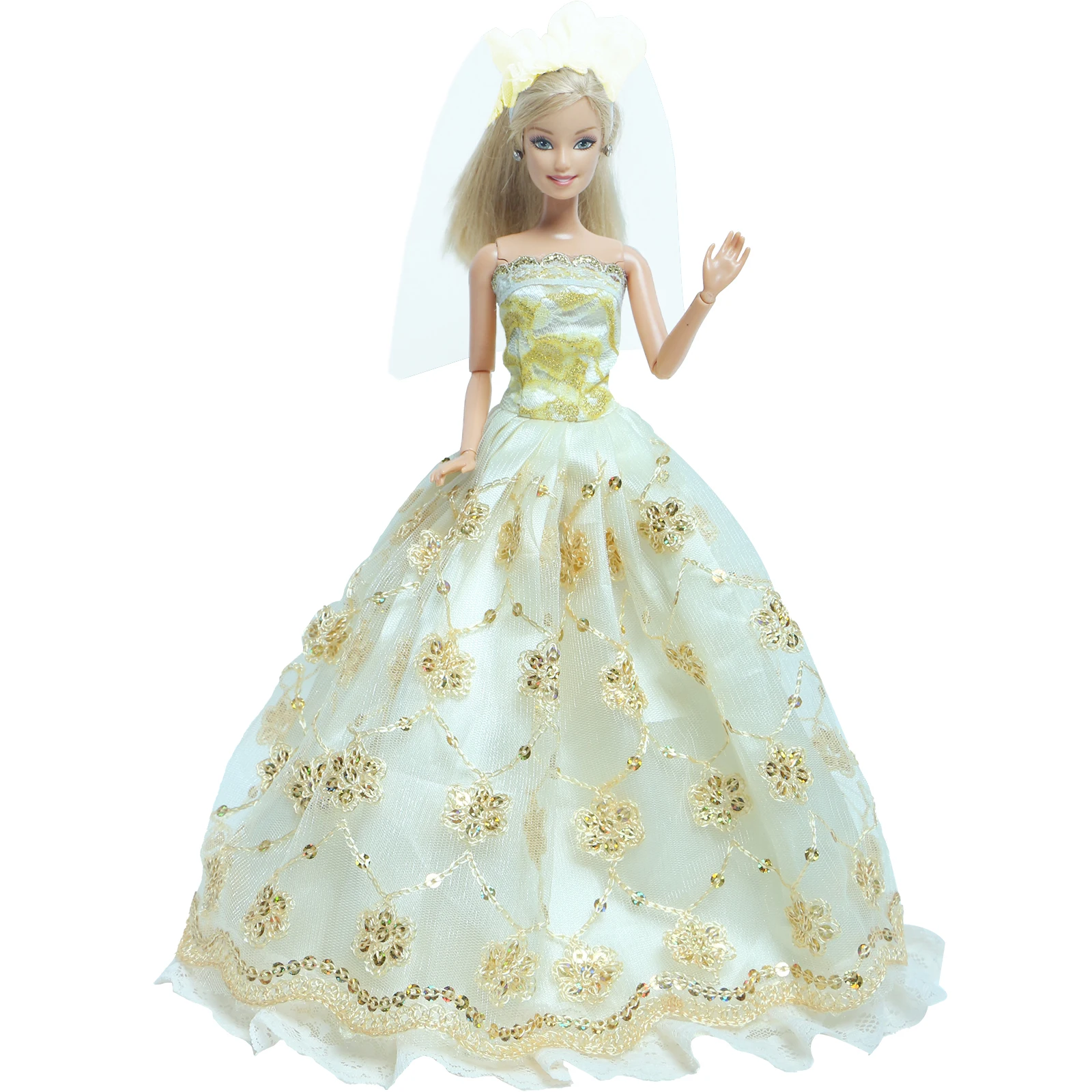 Модное желтое платье, свадебное платье с вуалью, элегантная кружевная одежда для принцессы, аксессуары для кукол Барби, игрушки для девочек