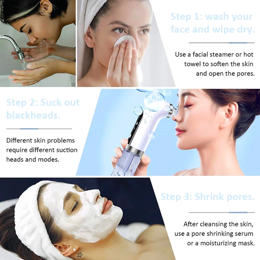 Обновленный дизайн в 2020 году-мощная всасывающая и надежная технология: устройство для удаления черных точек последнего поколения использует интеллектуальную технологию постоянной силы и технологию воздушного насоса, не повреждая кожу. Давление всасывания пор в вакууме составляет 55-100 кПа для обеспечения мощного всасывания, которое эффективно избавляется от черных точек, акне и увеличенных пор. Оснащен шестью модернизированными сменными зондами, которые каждый обслуживает различные потребности кожи.