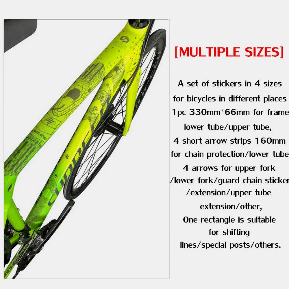 Набор наклеек в 4 размерах для велосипедов в разных местах, 1 шт. 330 мм * 66 мм для нижней трубы/верхней трубы, 4 коротких стрел 160 мм для защиты цепи/Нижняя трубка, 4 стрелки для верхней вилки/нижней вилки/наклейка на цепь/удлинитель/верхняя трубка/другое, один прямоугольник подходит для линий переключения/специальных постов/других.