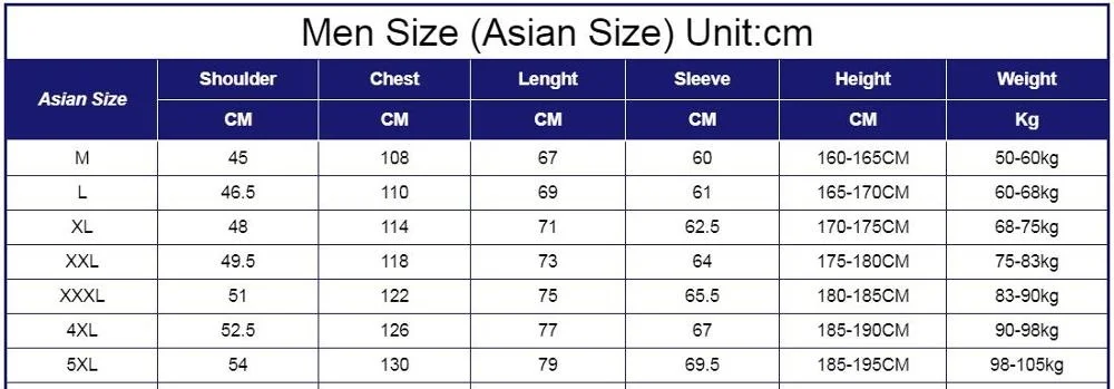 Мужской размер (Азиатский размер) Единица измерения: см Азиатский размер Плечо Грудь Длина Рукав Высота Вес См См См См См Кг М 45 108 67 60 160-165 см 50-60 кг L 46,5 110 69 61 165-170 см 60-68 кг XL 48 114 71 62,5 170-175 см 68-75 кг XXL 49,5 118 73 64 175-180 см 75-83 кг XХХL 51 122 75 65,5 180-185 см 83-90 кг 4XL 52,5 126 77 67 185-190 см 90-98 кг 5XL 54 130 79 69,5 185-195 см 98-105 кг - - - - - - -
