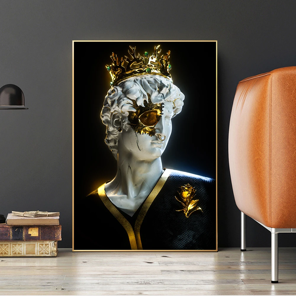 Скульптура золотого Давида с плакат с короной, настенное искусство, эстетическая статуя, Картина на холсте, художественные картины для декора гостиной