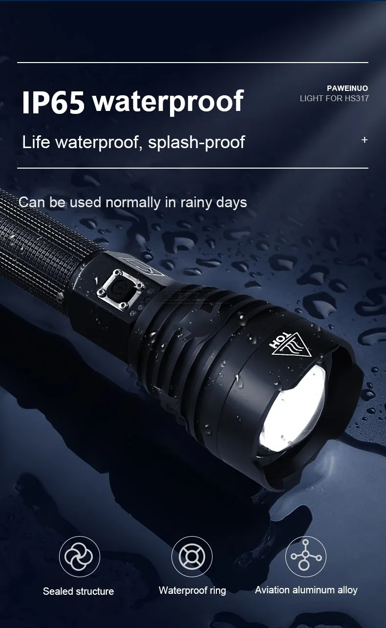 IP65 профессиональный водонепроницаемый, вы можете использовать фонарик в тяжелую погоду, например, сильный дождь, но вы не можете положить его в глубину в течение длительного времени.