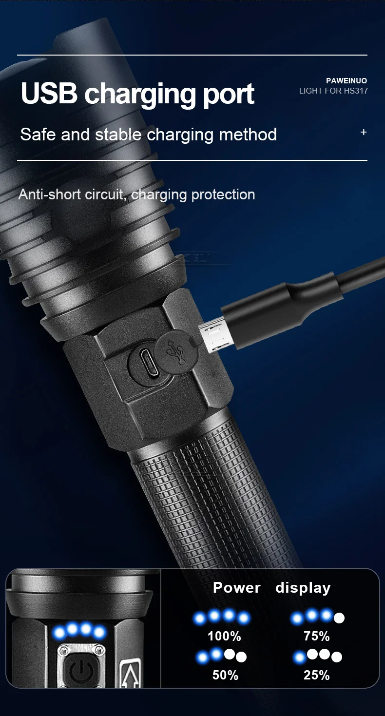 Фонарик имеет функцию защиты PCM во время быстрой зарядки, с тремя функциями: защита от перезаряда, защита от переразряда и защита от перегрузки по току, уровень 4, проверка мощности фонарика в режиме реального времени, делает вас безопаснее.