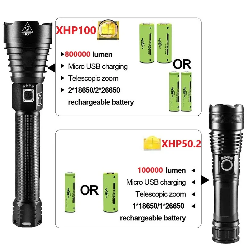 Характеристики фонарика1. Используйте светодиодный светильник XLamp XHP50.2 для максимального выхода.2. Используйте Высококачественный аккумулятор 18650 и 26650 для увеличения рабочего времени.3. Дисплей емкости аккумулятора, телескопический зум.4. Micro usb для компьютера USB, Автомобильный USB, USB разъем для зарядки, зарядный фонарик.5. Изготовлен из авиационного алюминиевого сплава прочный HAIII военный класс Жесткий анодированный.6. Водонепроницаемый в соответствии с IPX-6, водостойкий, может использоваться в дождливую погоду, но не может положить его в воду.7. Подходит для работы, охоты, альпинизма, рыбалки, кемпинга и активного отдыха и т. д.