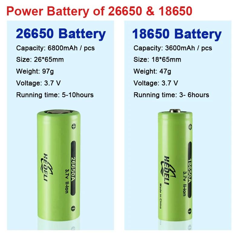 Материал батареи: литий-ионный аккумуляторБатарея напряжение: 3,7 VЕмкость аккумулятора: 2800-3000 мАч (18650) / 4800-5000 мАч (26650)Ток батареи: 20A непрерывная разрядка более 35a.Вес батареи: 47 г (18650) / 94 г (26650)