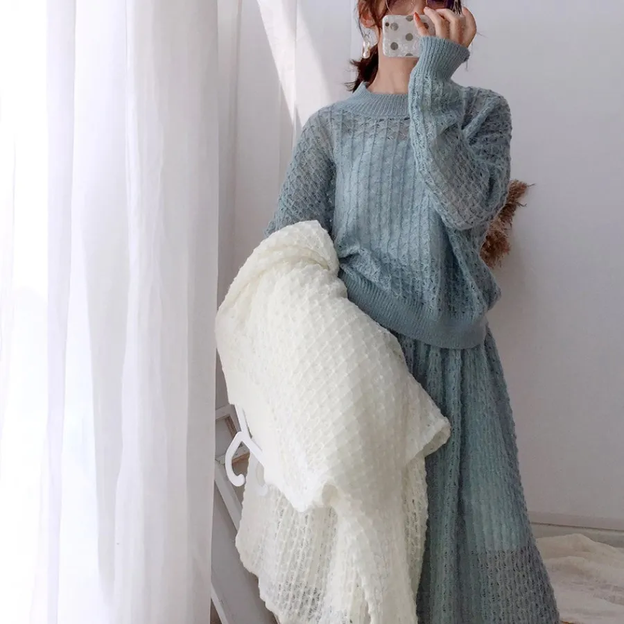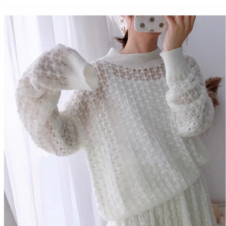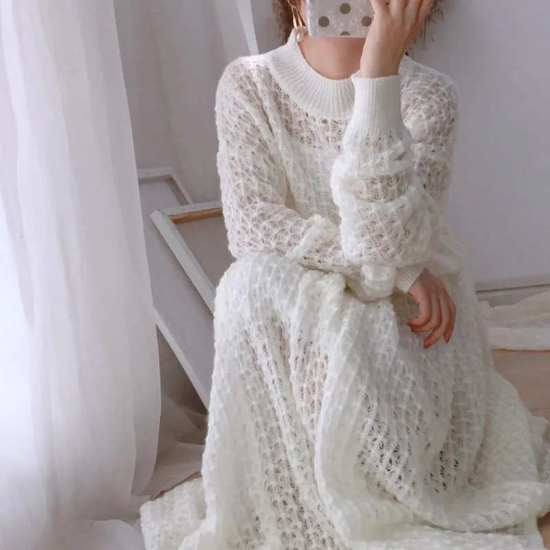 Новинка, костюм-свитер, платье, белый кавайный свободный ажурный вя...