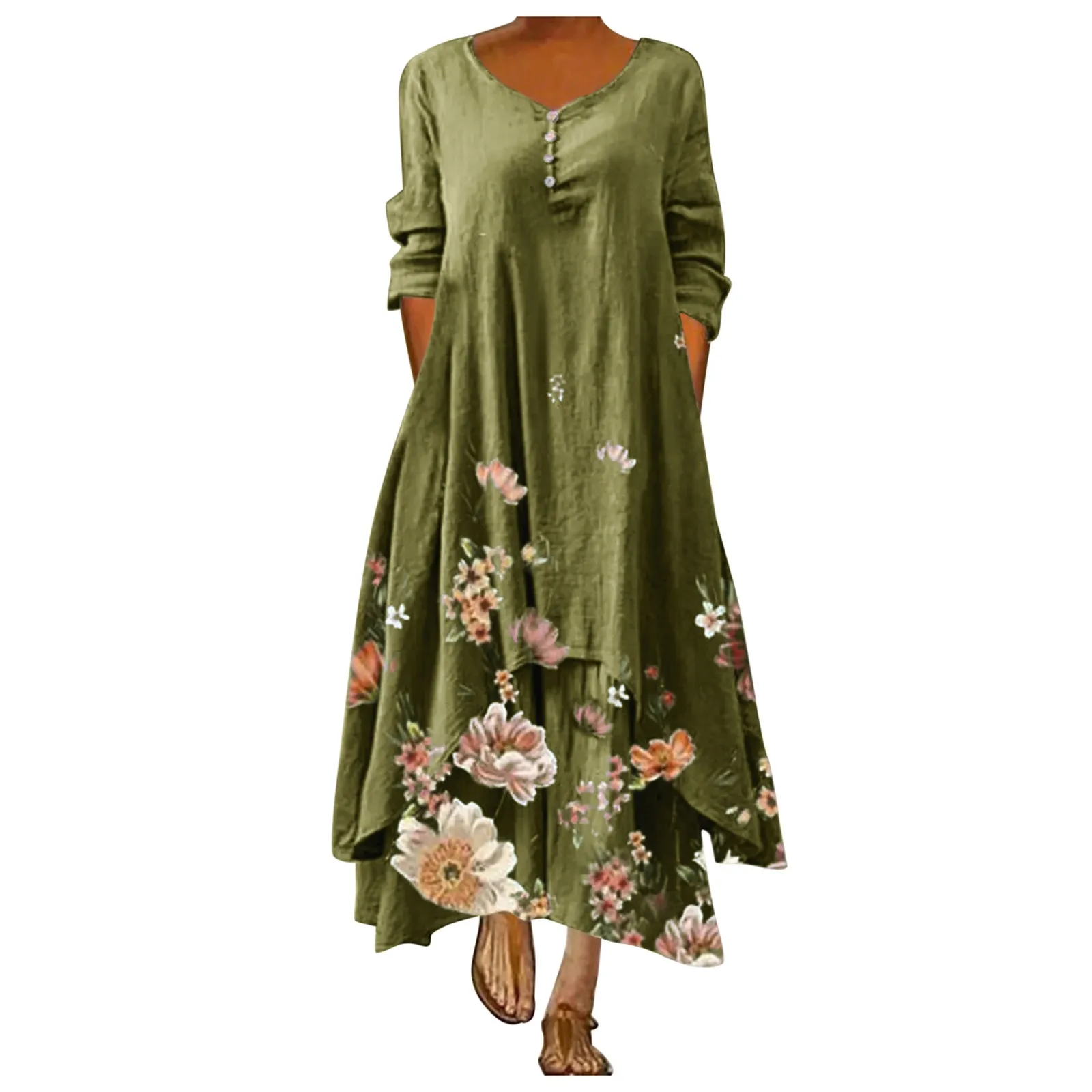 Женское Повседневное платье с цветочным принтом, асимметричное длинное платье с круглым вырезом и длинным рукавом