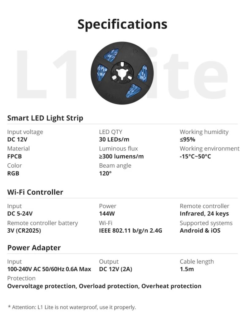 1. L1 lite не является водонепроницаемым, не используйте его на открытом воздухе. Если нужна Водонепроницаемая светильник вая лента, переместите на SONOFF L1.