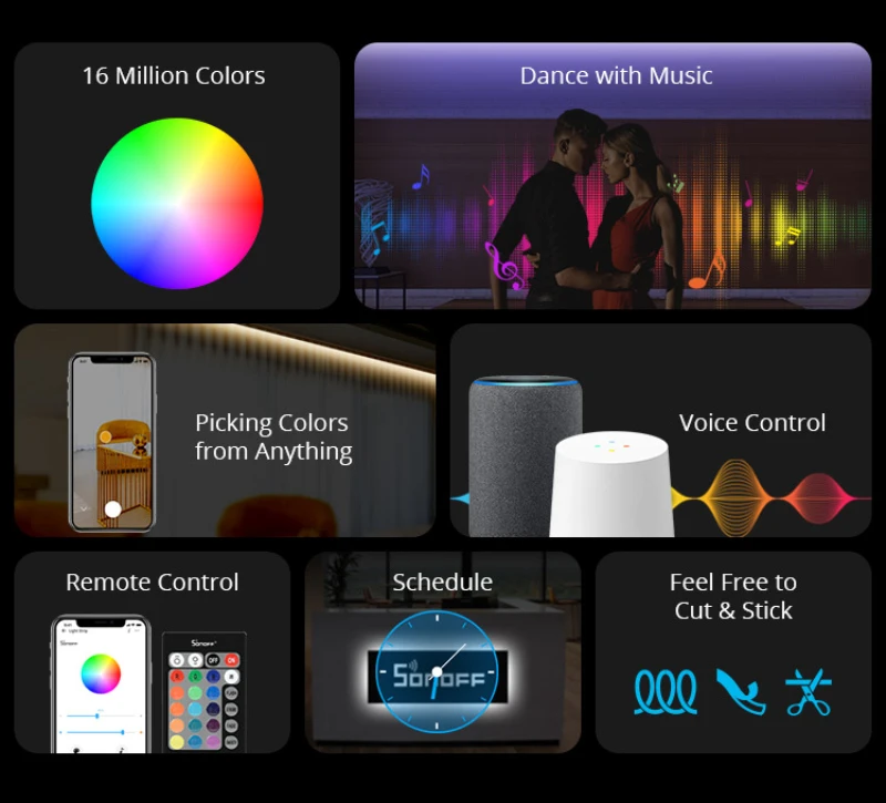 SONOFF L1 Lite можно использовать как в качестве дополнительного освещения, так и в качестве достойного украшения. Это простой и доступный способ добавить акцентного освещения в ваше внутреннее пространство, включая лестницы, шкаф, потолок, стену телевизора, рождественскую елку и многое другое, а также создать веселую атмосферу погружения. Легко управлять с помощью функции группировки, планирования и умной сцены в приложении, а простой умный способ управления без помощи рук может заставить его активировать и немедленно ответить на вас. (Голосовое управление требует объединения усилий с Alexa и Google Home.)