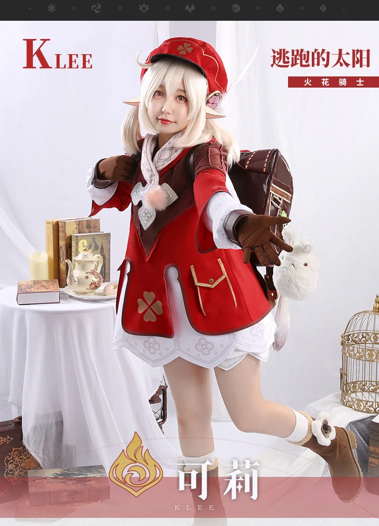 Костюм для косплея Game Genshin Impact Klee, парики, обувь, сумка, лоли, наряд для вечеринки, униформы, костюмы для женщин на Хэллоуин, карнавал