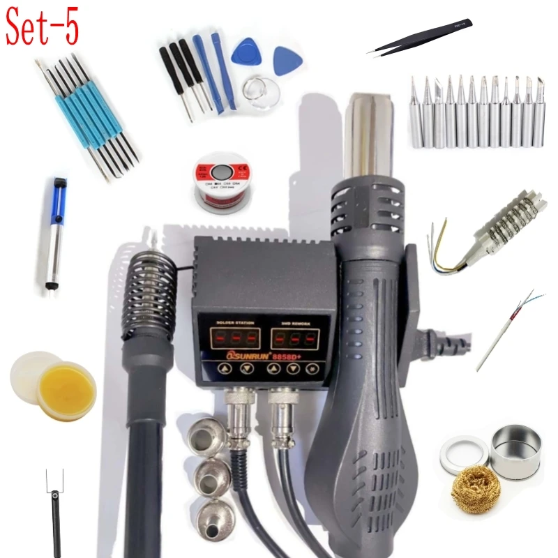 1 x 8858D + блок управления1 ручка для термофена1 ручка паяльника1 x пикап IC10x воздушные сопла1 x Кабель Питания1 нагреватель тепловой пушки5 наконечников паяльника1 х маленькая Лопата1 х Присоска (насос для демонтажа)1 х шарик для чистки коробки1 нагреватель паяльника2 x инструмент для открывания-тип палочки2 x инструмент для открывания-треугольник1 х маленькая присоска3 отвертки2 х паяльная проволокаВспомогательный сварочный инструмент 6 x SA-103xпинцет1 паяльная паста
