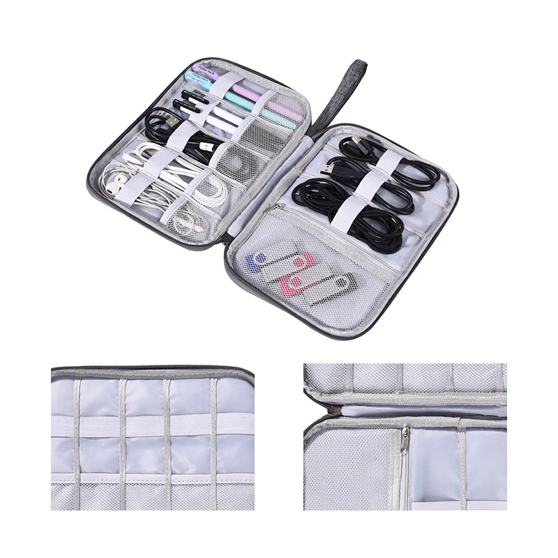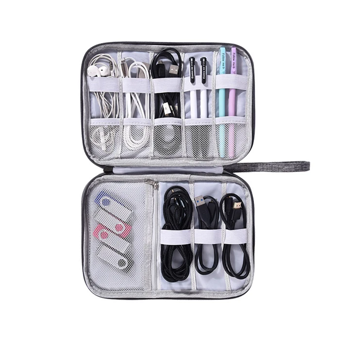 1. Катионный водонепроницаемый материал для лучшей защиты.2. Дизайн хранения, 8 эластичных петель для кабелей, наушников или pens.1 сетчатый карман на молнии и 5 эластичных сегментов сетки обеспечивают лучшую гибкость для организации аксессуаров.3. Мульти классификация, перспективный чистый дизайн, аккуратный и упорядоченный, сетчатый мешок изоляции, чтобы избежать запутывания, увеличенное пространство для хранения.4. Портативная ручка, тонкая проводка, прочная и носимая.