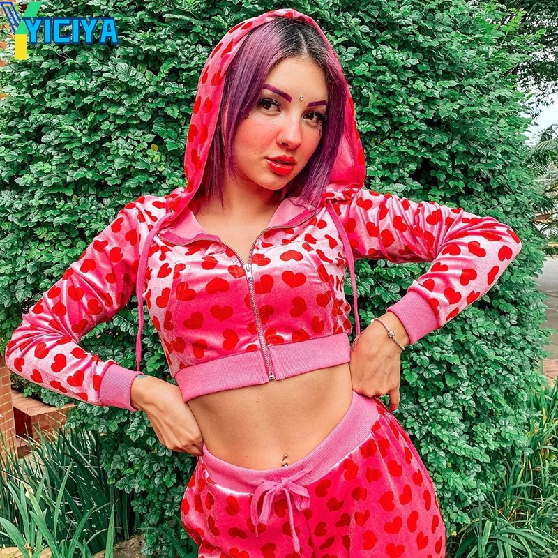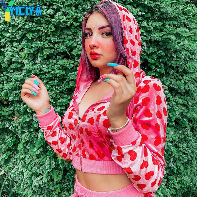 Женский Бархатный спортивный костюм Y2k, розовая толстовка на молнии с принтом сердца и прямые брюки, весенне-осенний Велюровый костюм