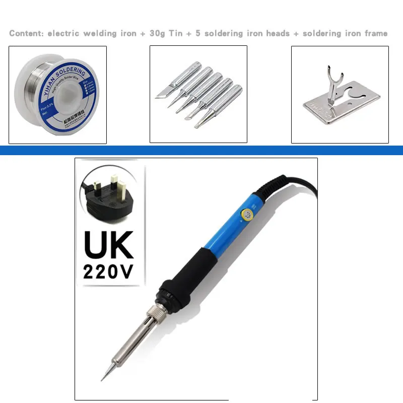 Электрический паяльник для ЕС, Великобритании, США, 110 В, 220 В, 60 Вт, с регулируемой температурой, инструменты для ремонта утюга с 5 железными наконечниками, подставка для паяльной проволокиПараметрыПаяльник для подключения к Длина: 18,5 см