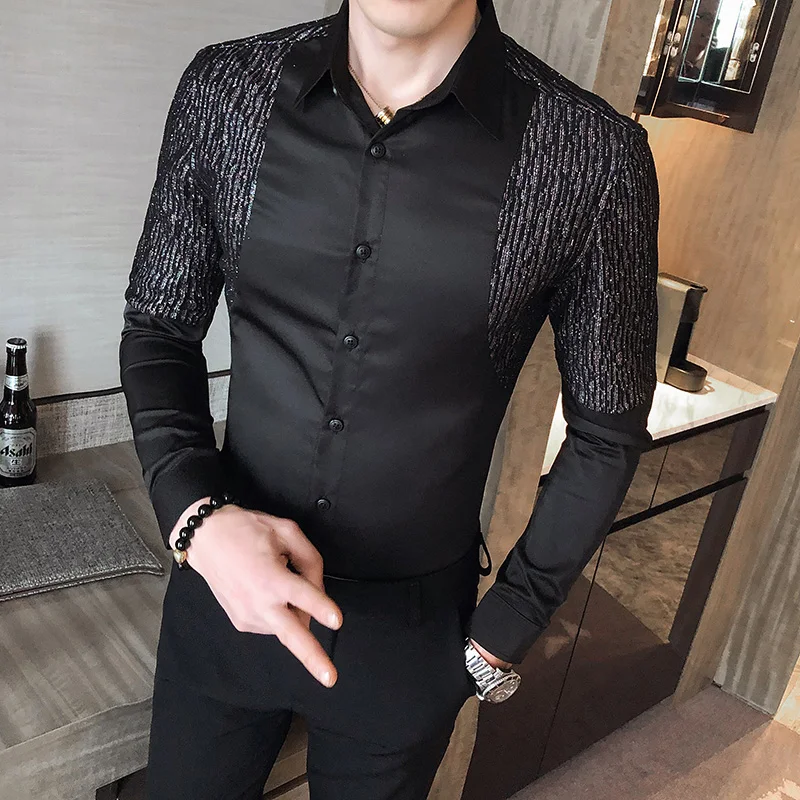 Мужская блестящая рубашка в стиле пэчворк, серебристая формальная Облегающая рубашка для ночного клуба и вечерние ринки, 2021