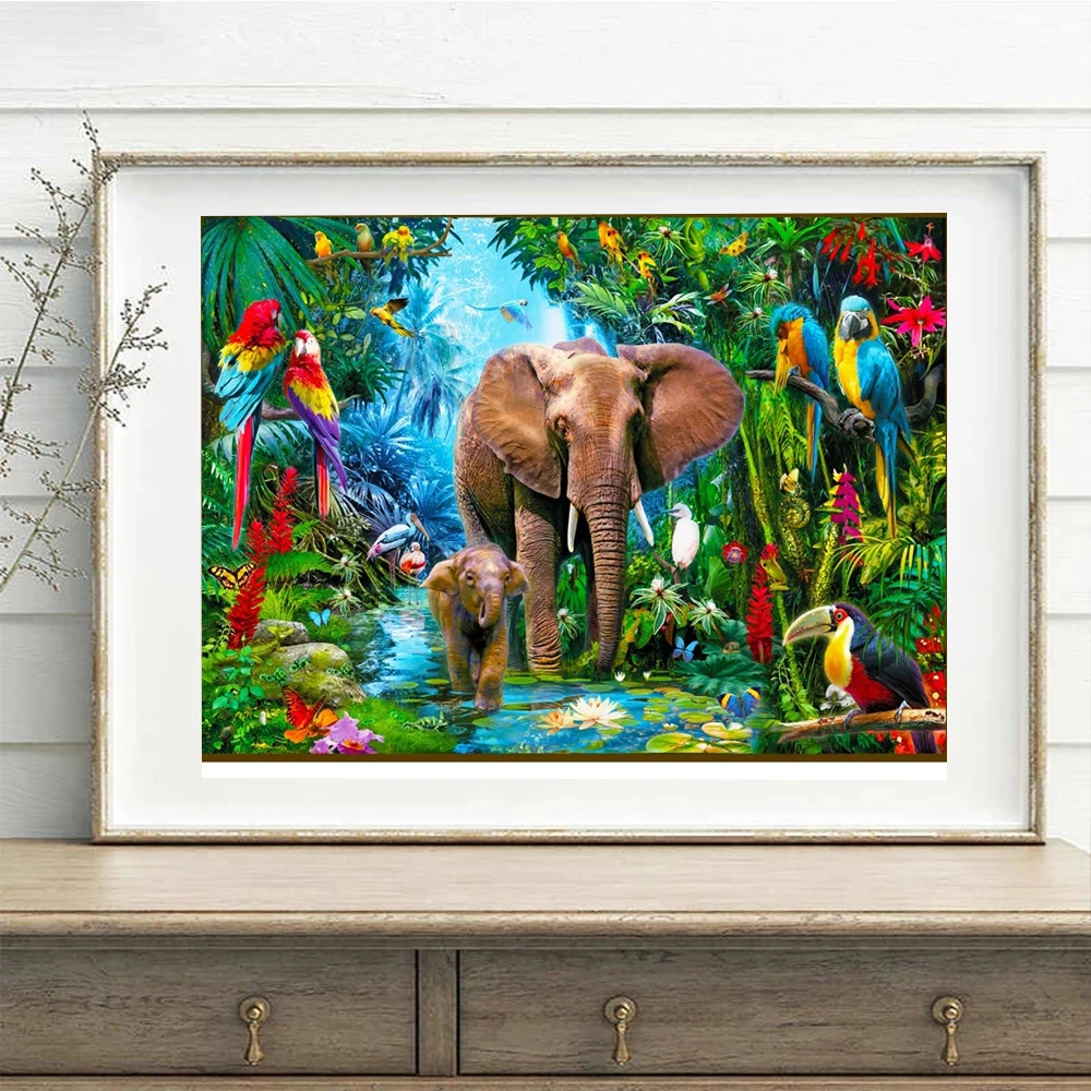 Алмазная вышивка, слон в джунглях, алмазная живопись с попугаями, вышивка крестиком, Алмазная мозаика, украшение, шитье, подарки,
