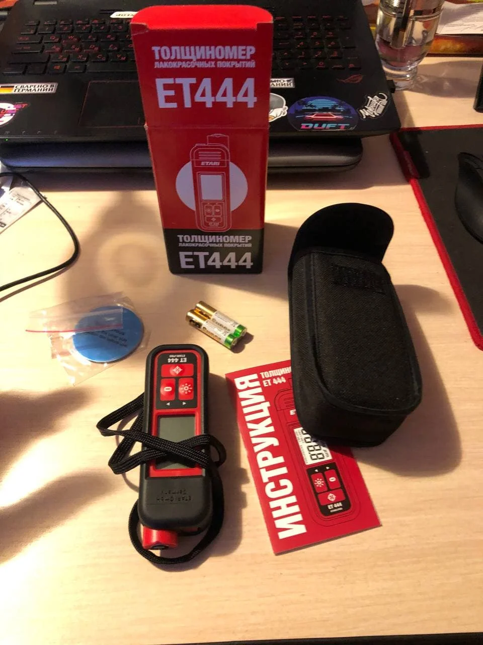 Заказ делали на новогодних праздниках. Продавец отвечает молниеносно. Отправил СДЭКом в наш город в пункт выдачи. Об этом указано на странице. Дошло всё быстро за несколько дней. Брали ЕТ444 начитавшись отзывов. Работает норм, калибруется. Калибровку держит. Как и указано, в комплекте чехлы и веревочка. Продавцом довольны.